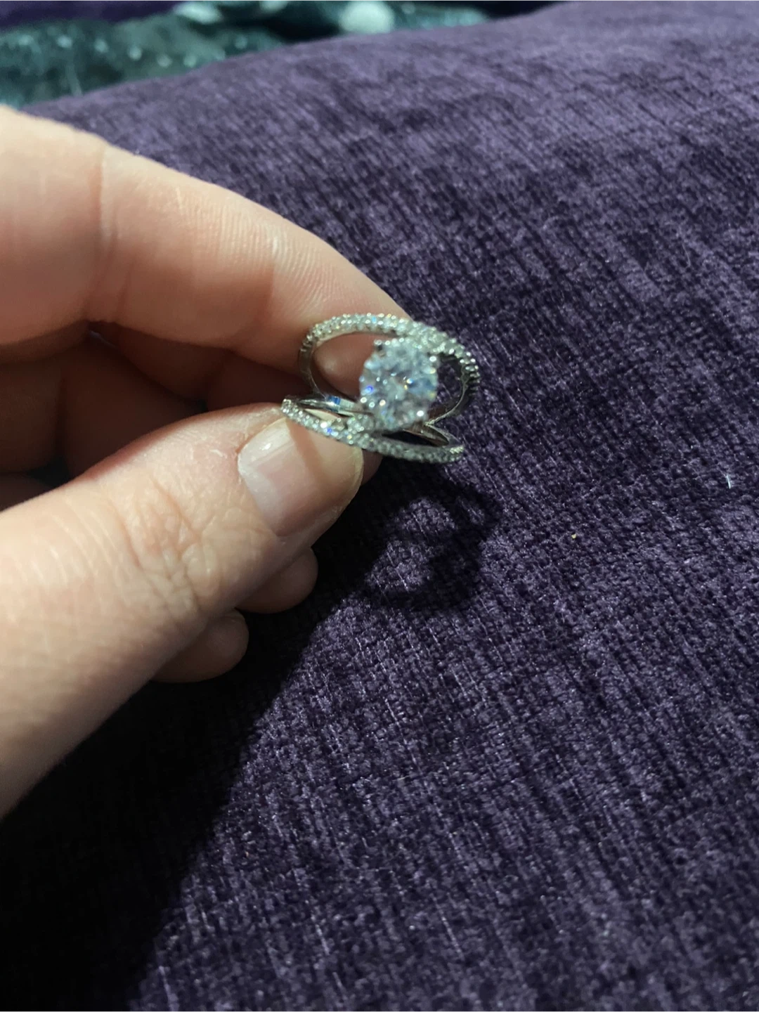 This is a beautiful ring featuring a large, sparkling center stone surrounded by smaller stones along the band. The metal appears to be silver-toned. It's a lovely piece for any occasion!