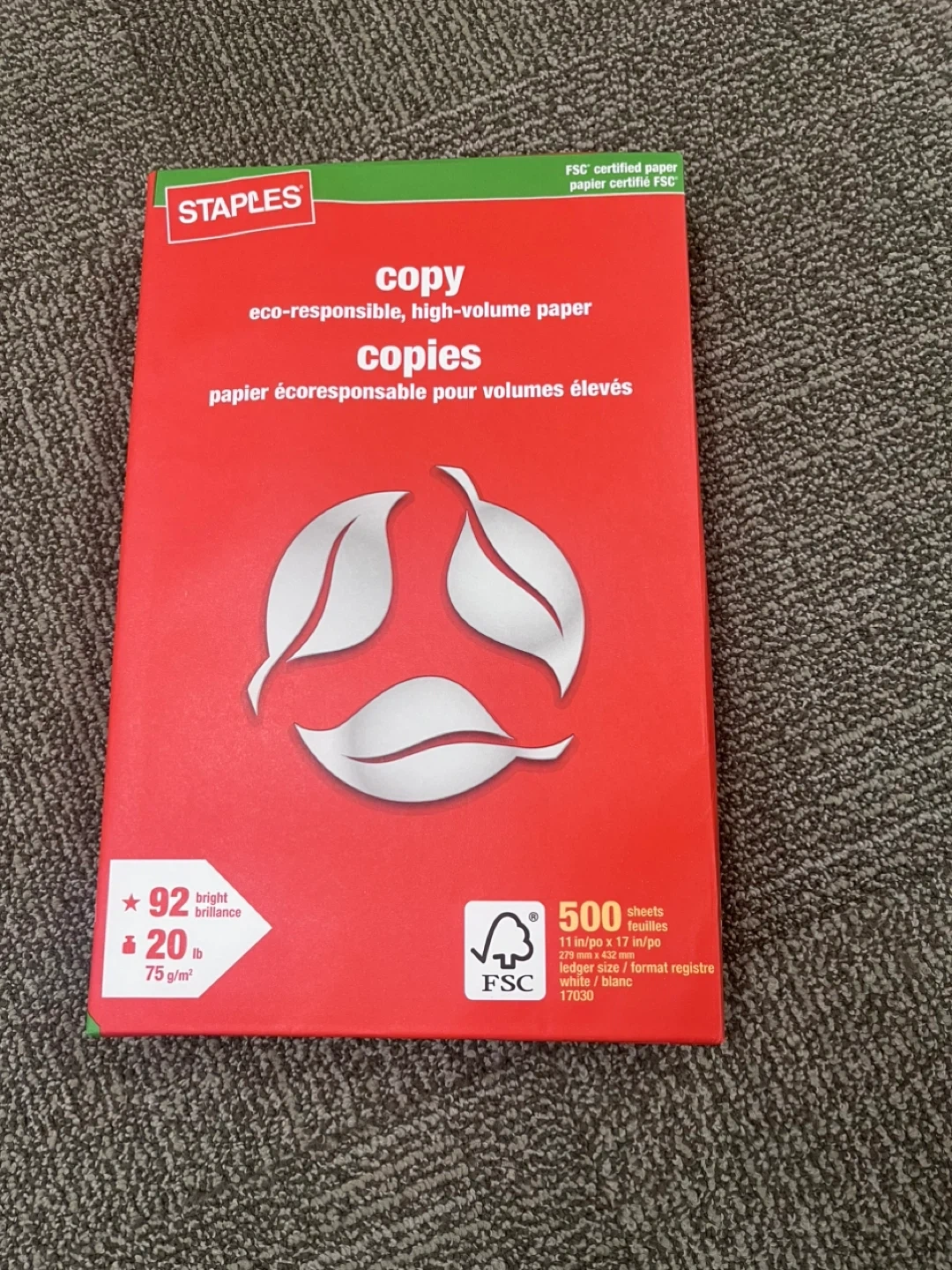 34Selling a pack of Staples copy paper. It's eco-responsible, high-volume paper. Contains 500 sheets of 11 in x 17 in ledger size paper. Brightness is 92 and weight is 20 lb (75 g/m²). 10 pack available Price is $10 each
