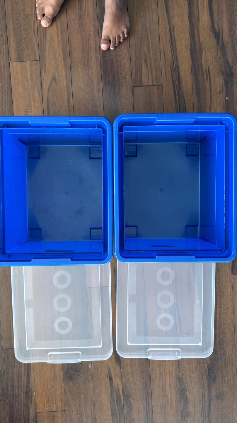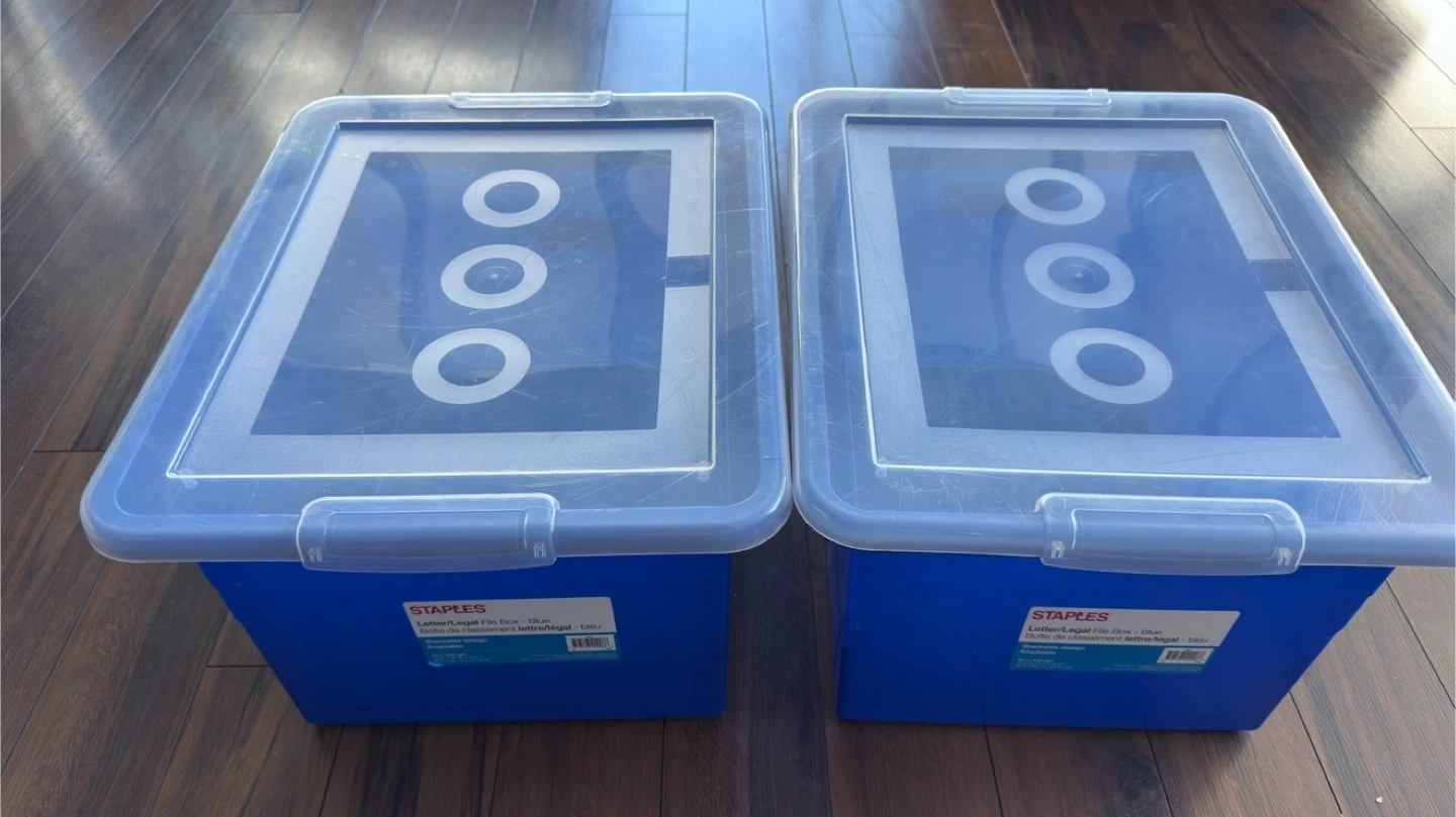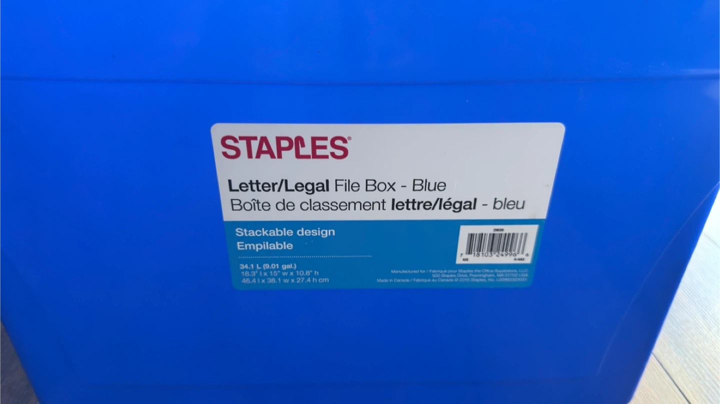 Two blue Staples Letter/Legal File Boxes for sale! These are great for organizing your documents. They feature a stackable design and come with lids