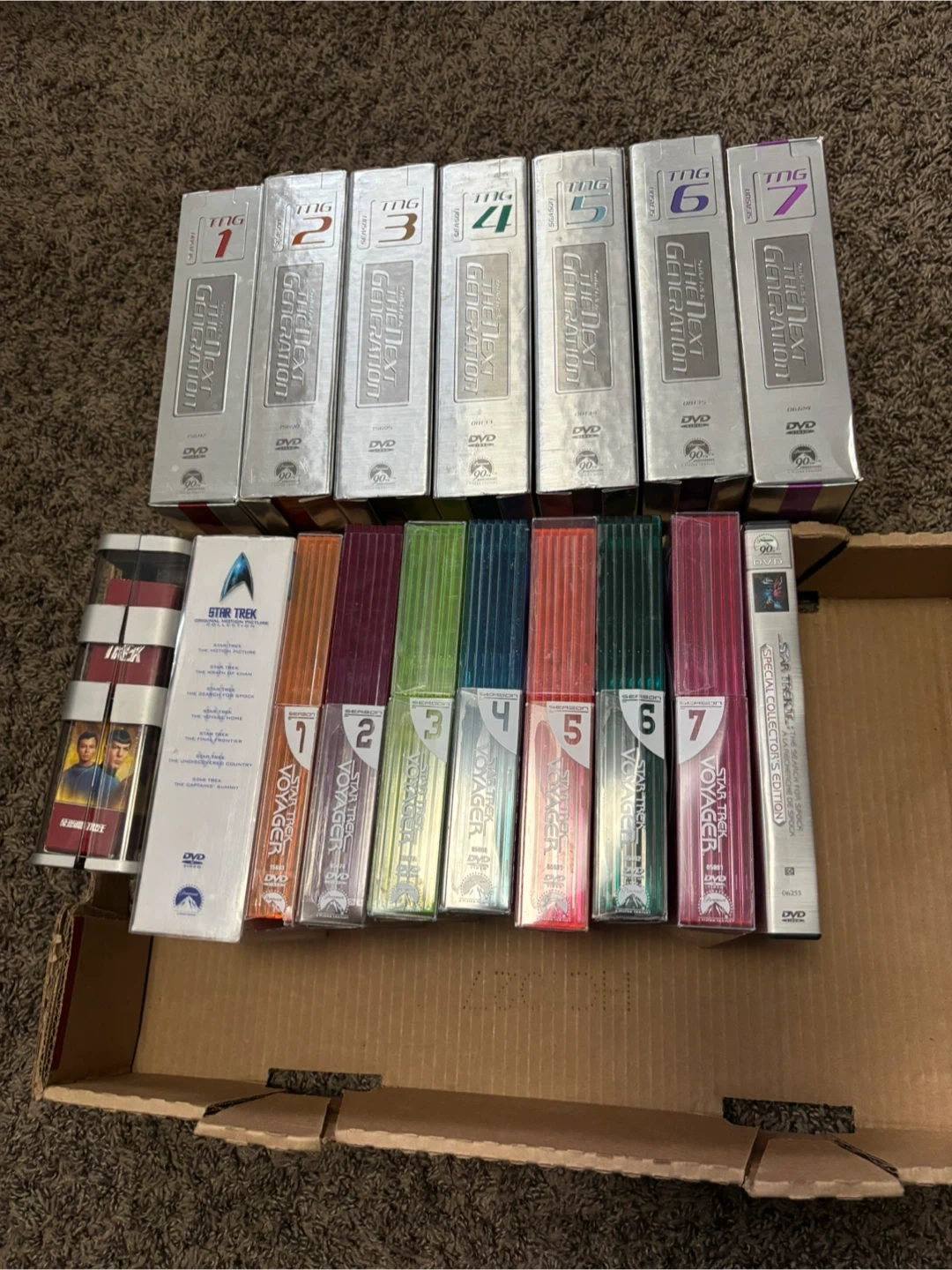 60Can buy individual, though I’d prefer sets being bought. Season 7 of next gen is missing its 5th disc and poster, but everything else is included. As of my most recent test all dvds work. Pick up or meet in Beaumont. Includes Star Trek The Next Generation complete series, Star Trek Original series season 3, Star Trek original motion picture collection, Star Trek Voyager complete series, and Star Trek III: the search for Spock special collectors edition. Next gen is $15 each or $80 for the set Next gen season 7 is $10 Voyager is $15 each or $85 for the set Original series season 3 is $20 Star Trek III is $15 Original motion picture collection is $20 If you buy everything it’s $200