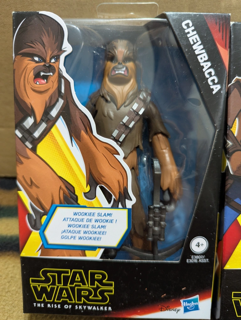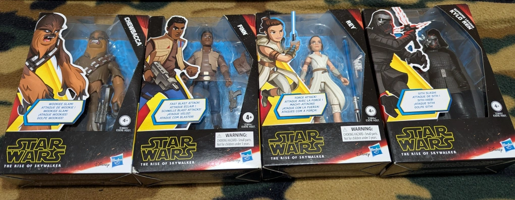 67Four Star Wars Galaxy of Adventures action figures. Chewbacca, Finn, Rey, and Kylo Ren. New, in box. Collectible figures from Hasbro. Unopened with slight shelf wear Porch Pickup ONLY Southdown/Mississauga area