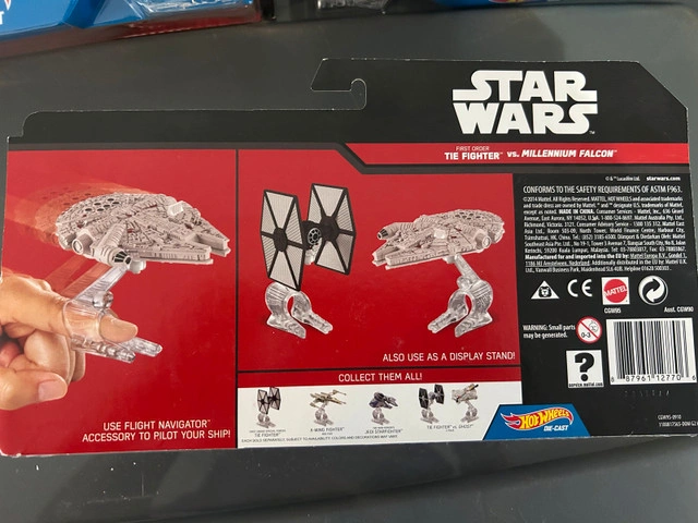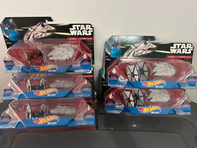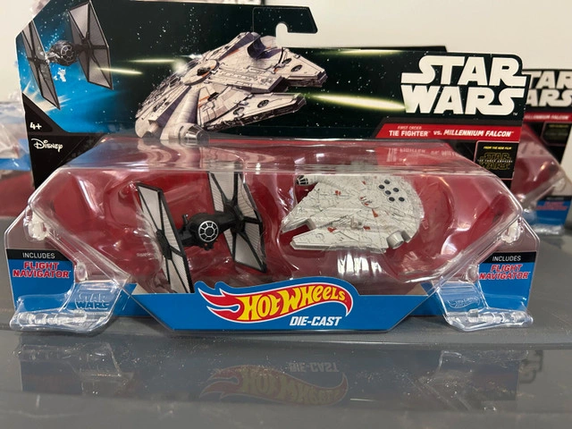 1565 available - $25 each. Sold separately or as a lot. I'm offering a set of new Star Wars Hot Wheels die-cast sets featuring the iconic Millennium Falcon and TIE Fighter. These collectibles are perfect for Star Wars enthusiasts and Hot Wheels collectors alike. Each set includes a flight navigator accessory to pilot your ship! Key features: * Die-cast metal construction * Includes flight navigator accessory * Officially licensed Star Wars product