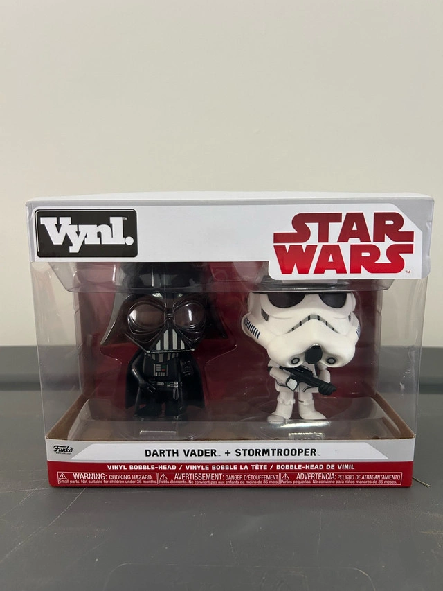 156I'm offering a new Star Wars Vynl. Darth Vader and Stormtrooper bobble-head set. The figures are in excellent condition and come in the original packaging. A must-have for any Star Wars collector! Never opened
