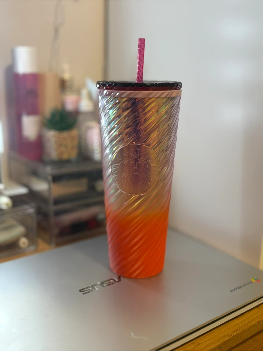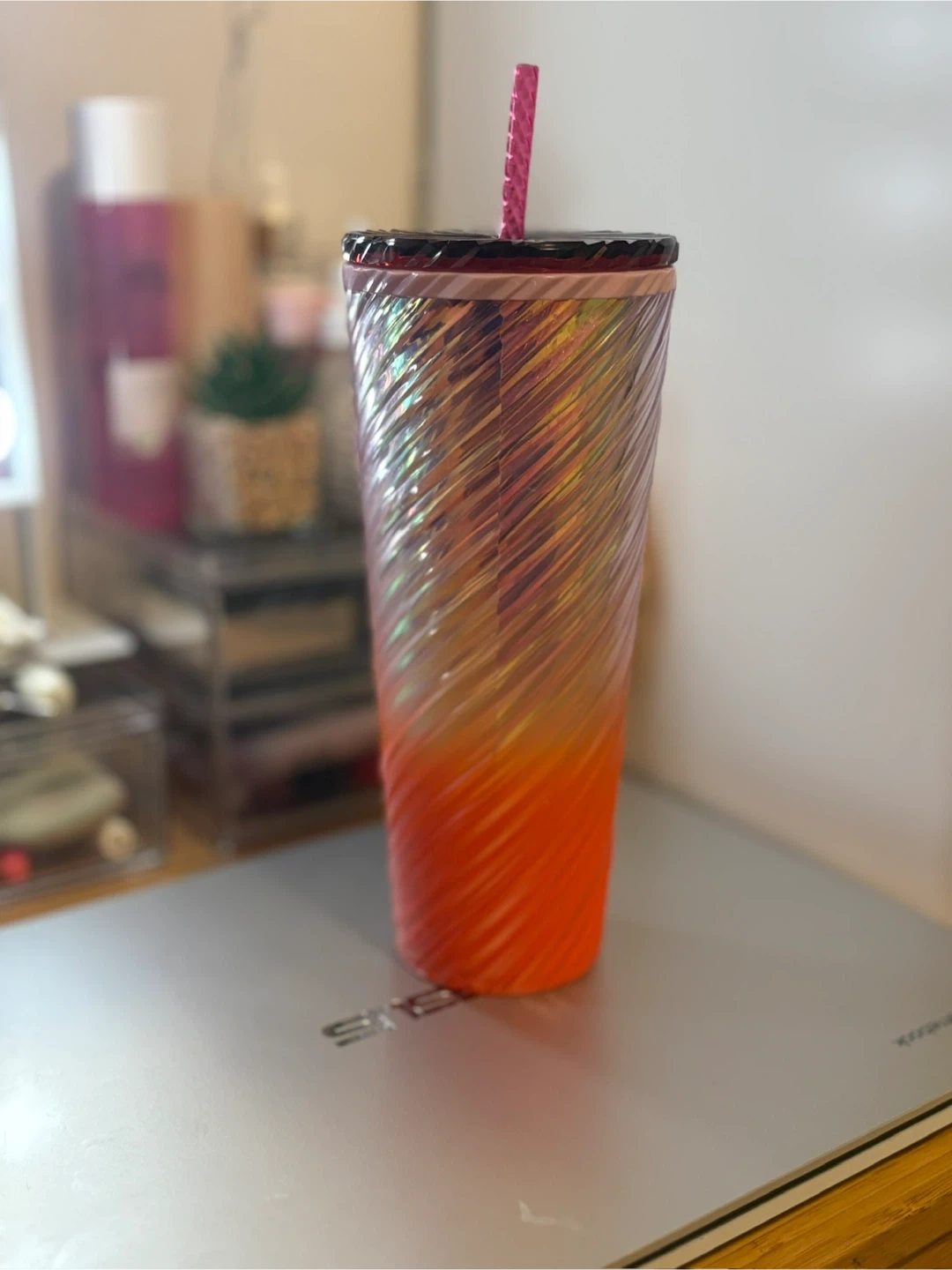 15original price: $40–Selling a Starbucks iridescent swirl cold cup. It's in great condition and ready for all your cold beverages! The colours are so pretty and shift in the light. Perfect for summer!