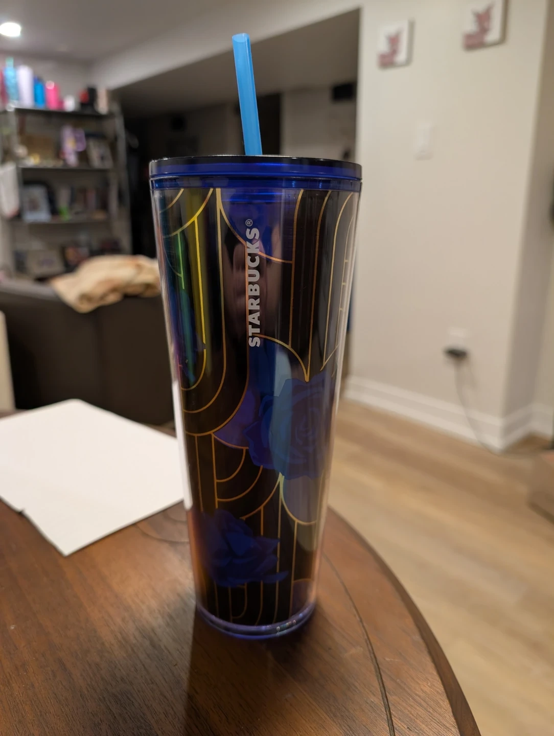 5Selling a Starbucks tumbler! It has a really nice design with a blue and gold colour scheme. Comes with a straw.