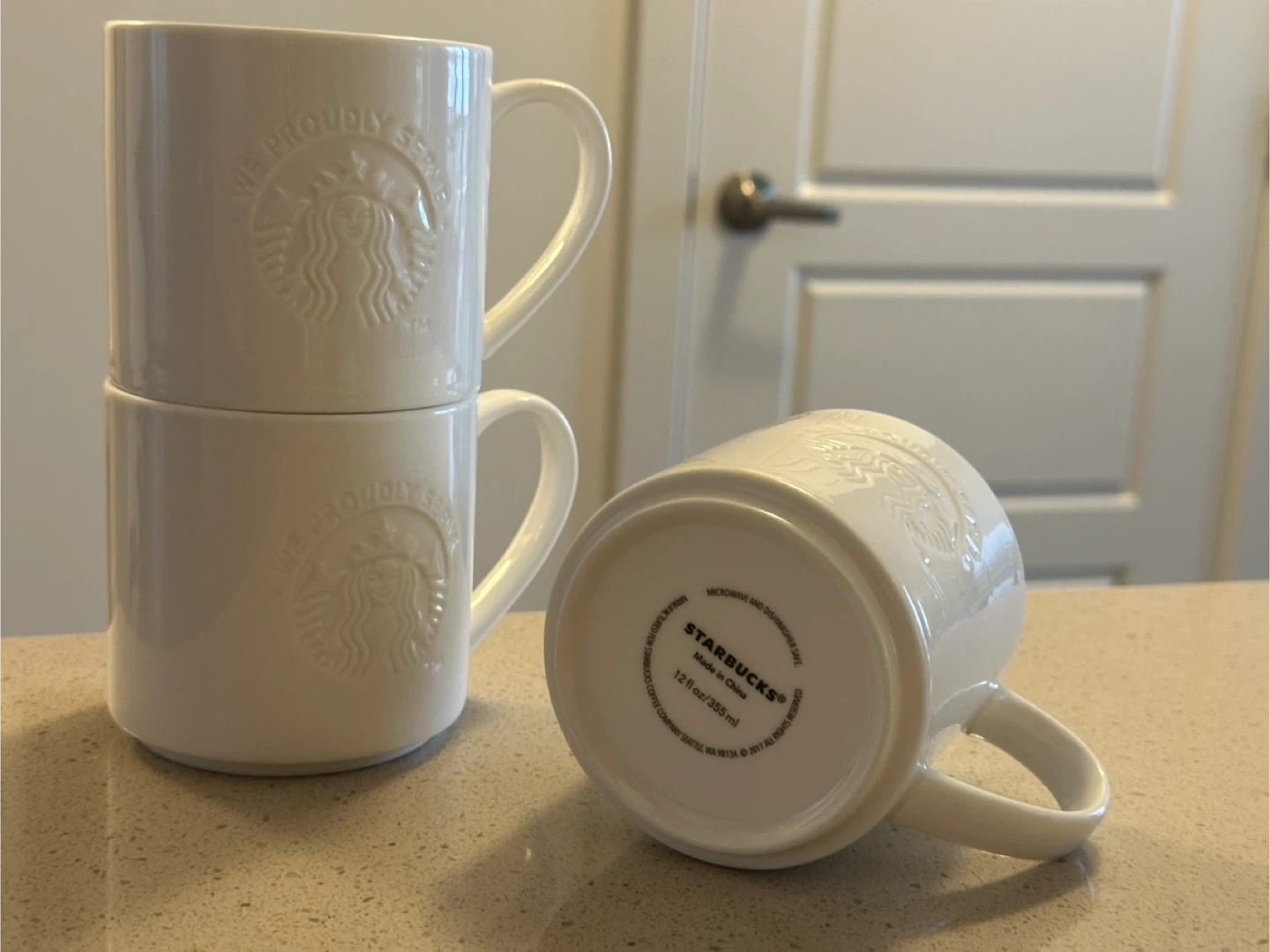 10Selling a set of Starbucks mugs! They're a classic white ceramic and hold 12 fl oz (355 ml). They are microwave and dishwasher safe, perfect for your daily coffee or tea