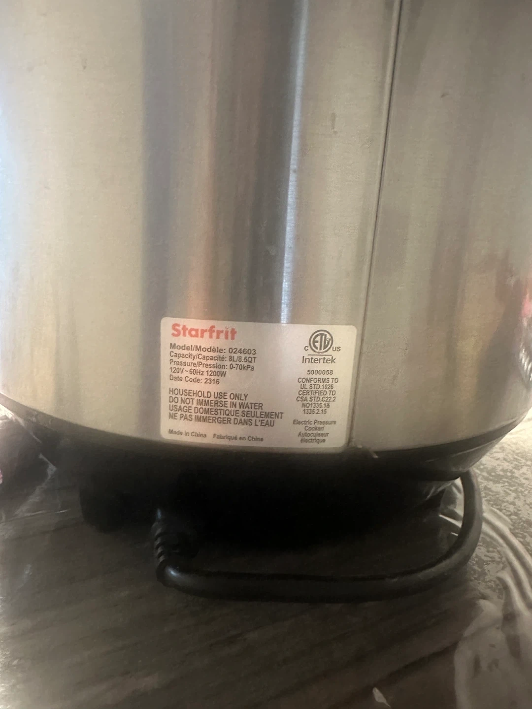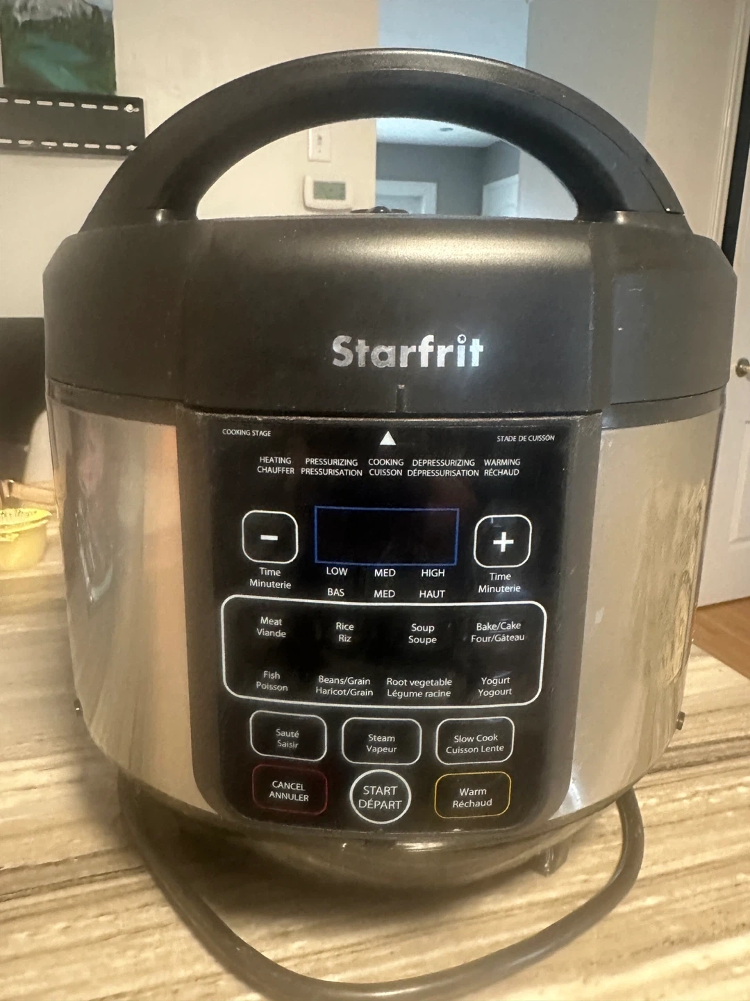 73Selling a Starfrit electric pressure cooker, model 024603. It has a capacity of 6L/6.5QT and operates at 120V~60Hz 1200W. Perfect for making quick and easy meals!