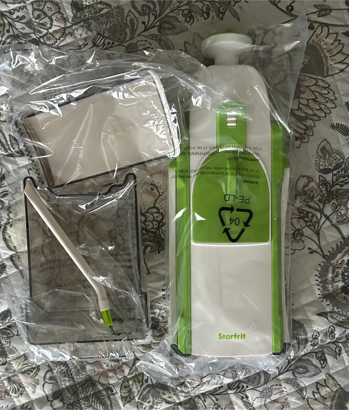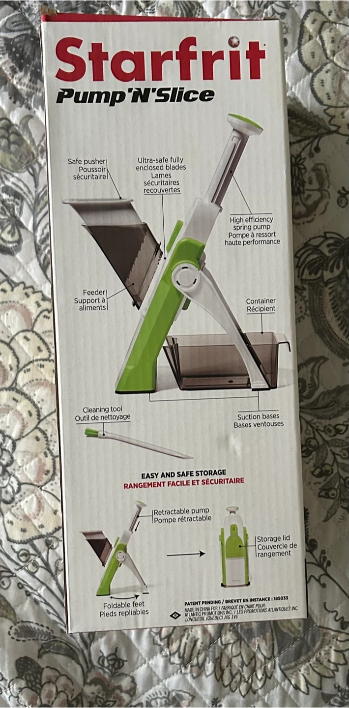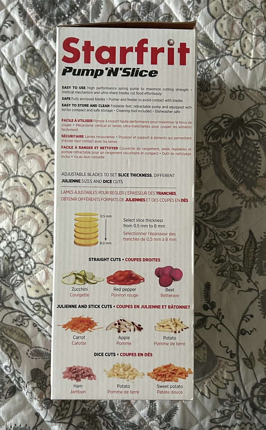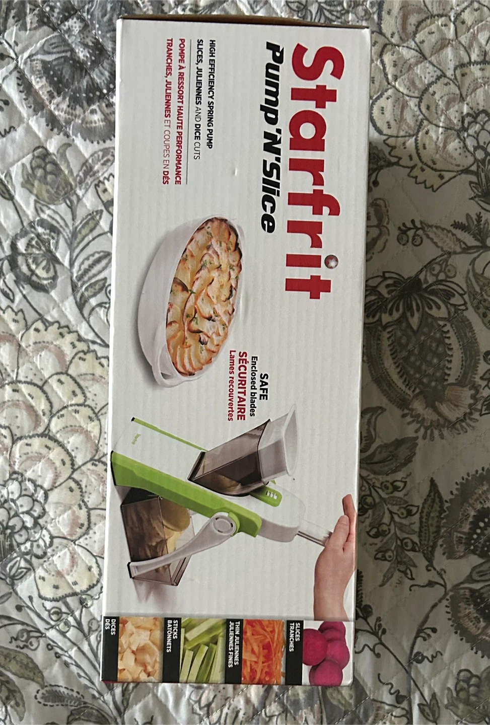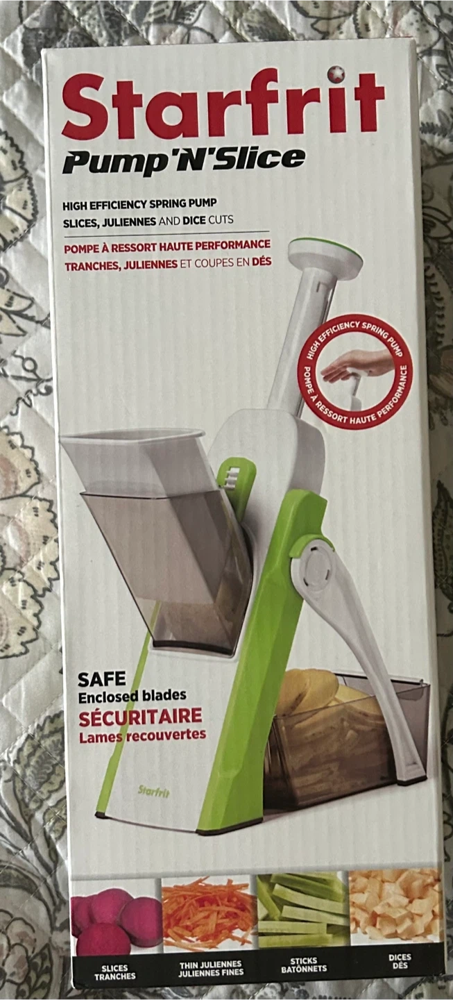 10I'm selling a brand new Starfrit Pump'N'Slice! It's still in its original packaging and has never been used. This high-efficiency spring pump slices, juliennes, and dices with safe, enclosed blades. Perfect for making quick and easy meals!