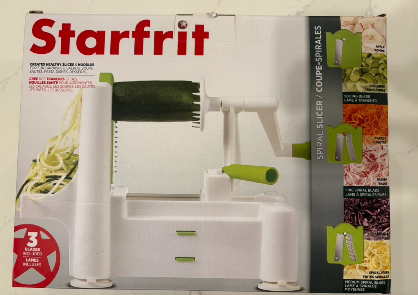 69Get ready to make healthy slices and noodles with this Starfrit Spiral Slicer! Perfect for zucchini, potatoes, salads, soups, pasta dishes, and desserts. It includes three blades for various cuts. The box is included!