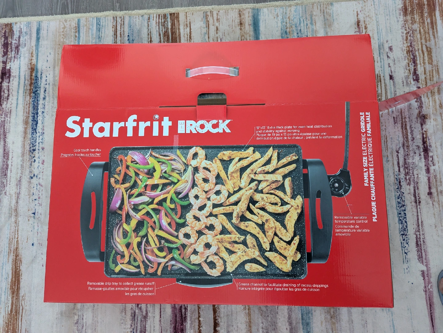 60Selling a brand new Starfrit The Rock electric griddle! It's still in its original box and has never been used. This family-size electric griddle features a 12" x 18" plate, perfect for cooking meals for the whole family. It also has cool-touch handles and a removable drip tray for easy cleaning!