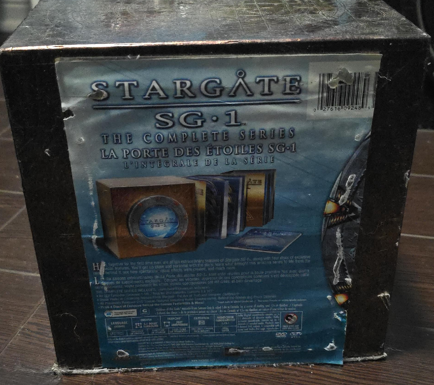 Selling the complete series of Stargate SG-1 on DVD! This includes all 10 seasons and is in French and English. The box is a little worn, but the DVDs are in great shape and ready for a rewatch