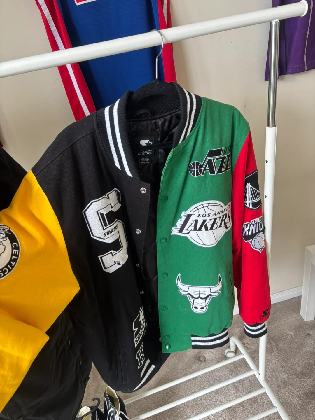 Selling a Starter Black Label NBA varsity jacket. It's a size XL and features a cool design with different NBA team logos. Great for any basketball fan!