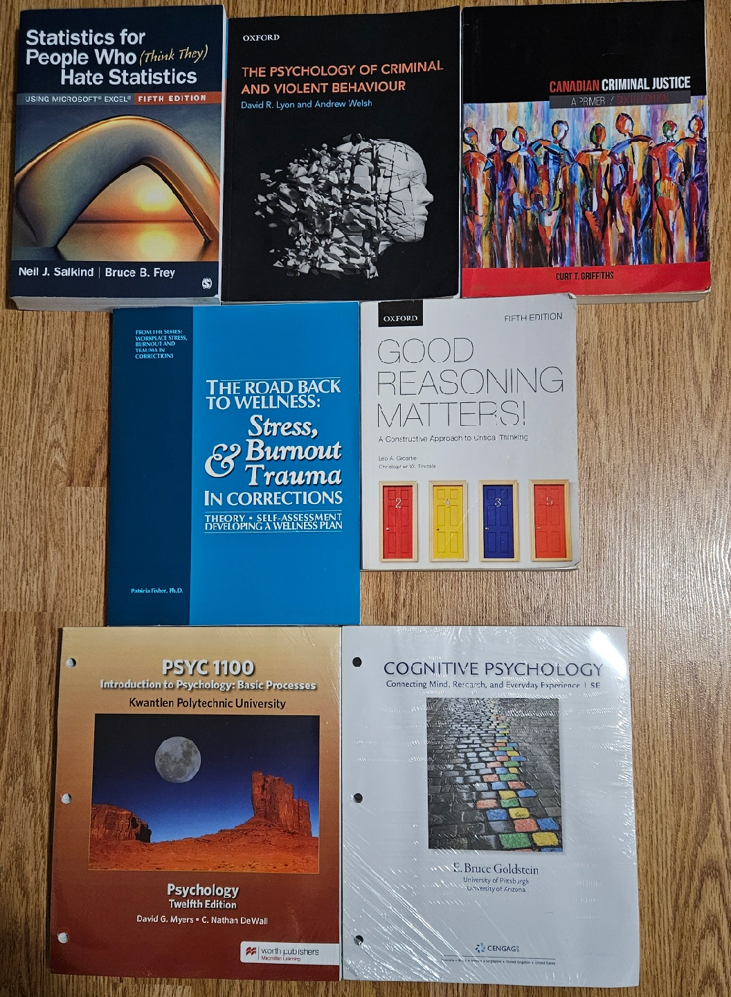 60π Statistics, Psychology & Criminal Justice Textbooks for Sale (Pickup Only) All books are in great condition β clean pages, no missing content. Perfect for Statistics, Psychology, Criminology, and Justice Studies students at KPU, Douglas, UFV, or SFU. π΅ Cash only, no trades or e-transfers πPickup in Surrey π Bundle discounts available! --- π Titles & Prices: 1. Statistics for People Who (Think They) Hate Statistics (Using Microsoft Excel, 5th Edition) β Neil J. Salkind & Bruce B. Frey β $40 2. The Psychology of Criminal and Violent Behaviour β David R. Lyon & Andrew Welsh β $30 3. Canadian Criminal Justice: A Primer (6th Edition) β Curt T. Griffiths β $30 4. The Road Back to Wellness: Stress, Burnout & Trauma in Corrections β Patricia Fisher β $20 5. Good Reasoning Matters! A Constructive Approach to Critical Thinking (5th Edition) β Leo A. Groarke & Christopher W. Tindale β $20 6. PSYC 1100: Introduction to Psychology β Basic Processes (KPU custom) β Myers & DeWall, 12th Edition β $30 7. Cognitive Psychology: Connecting Mind, Research, and Everyday Experience (5th Edition) β E. Bruce Goldstein β $40 -- π Take all 7 books for $180 (save $30!) Message for availability or bundle offers.