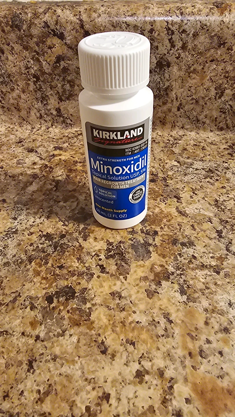 Kirkland Signature Minoxidil topical solution for men. Extra strength 5% USP formulation for hair regrowth. Unscented, one-month supply. 60 mL (2 FL OZ).