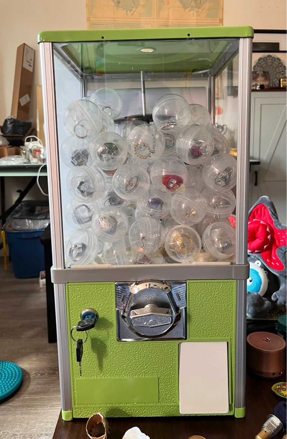 Fun ring vending machine filled with assorted rings. Comes with keys for operation. Great for parties or events!