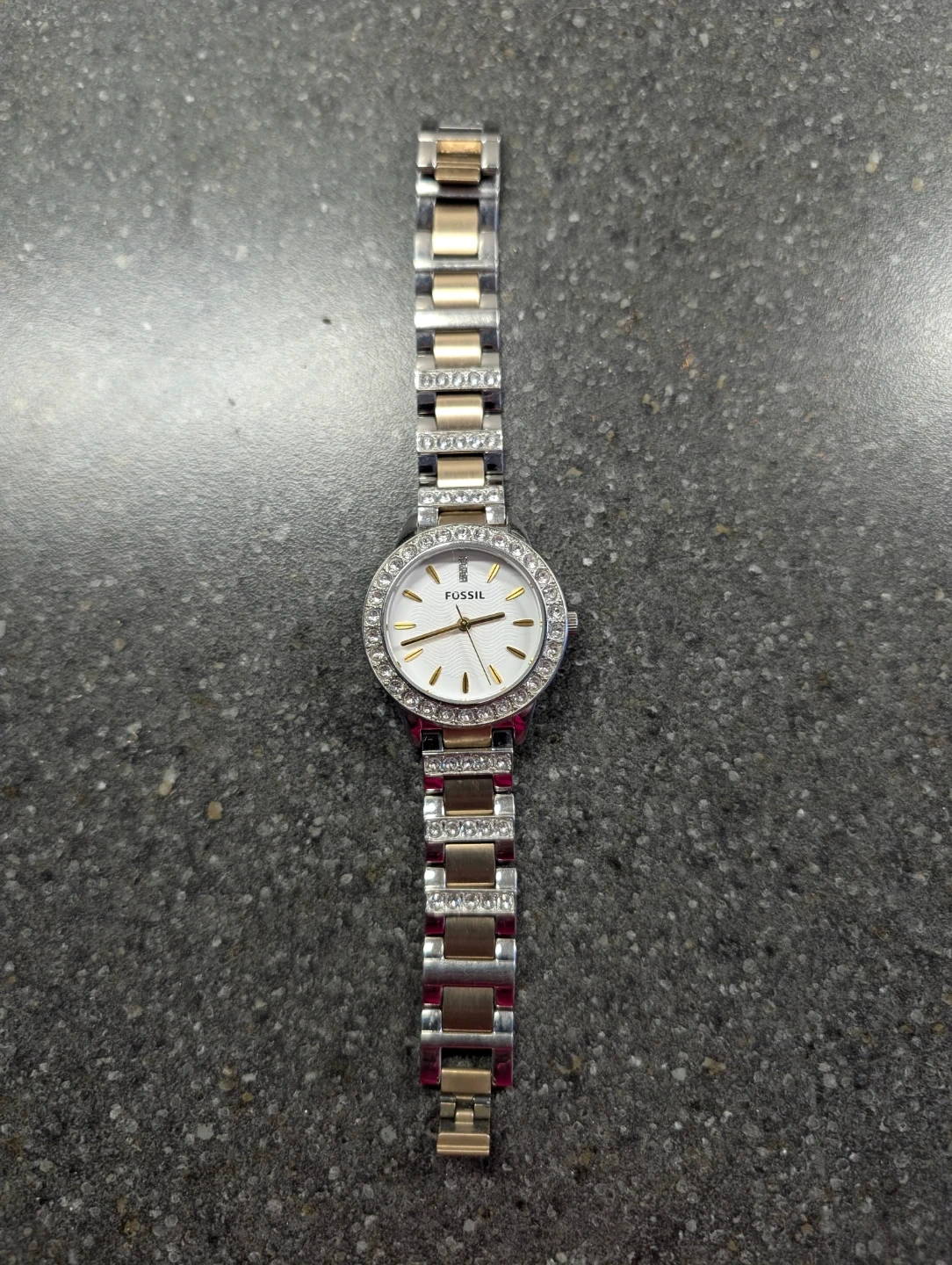 Selling a Fossil women's watch in two-tone stainless steel. It's a stylish and versatile accessory that can be dressed up or down. The watch features a white face and a stainless steel band with gold-tone accents. It's in good condition and ready to wear!