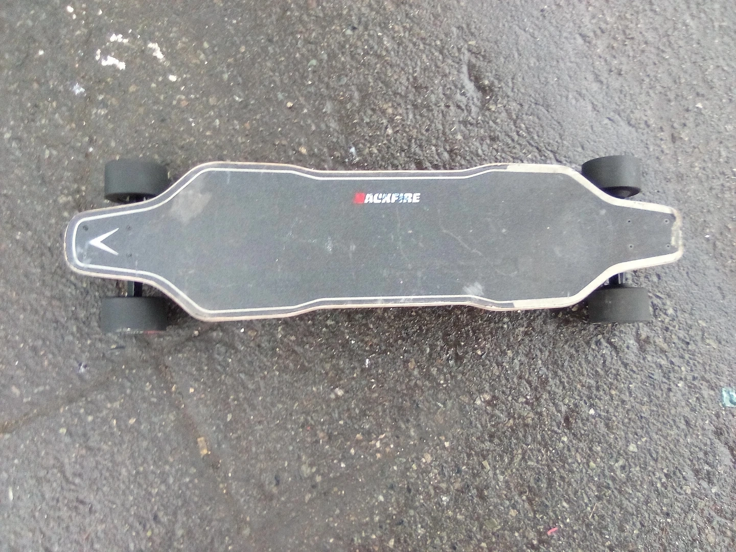 This is a Backfire electric skateboard. It has a black deck with a white pinstripe around the edge. The wheels are black.