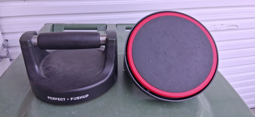 A pushup device featuring a handle. A balance trainer with a red border is included. Perfect for those calming, meditative pushups.