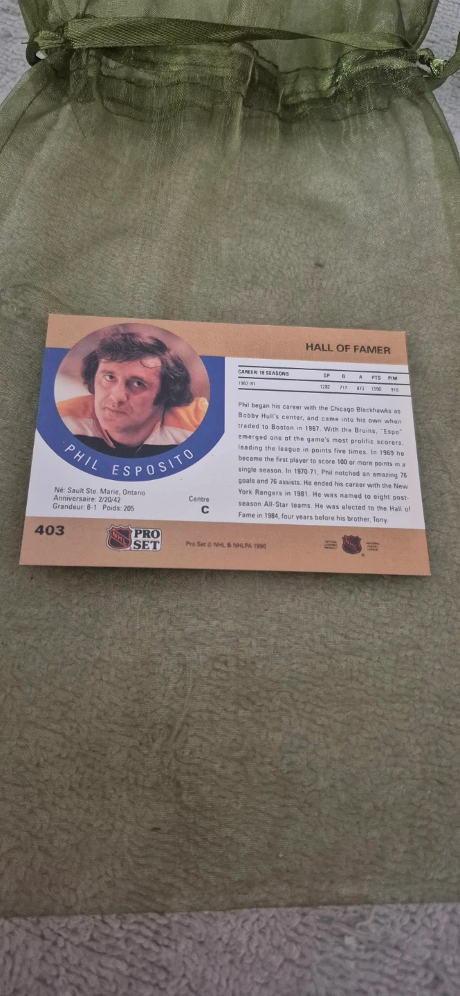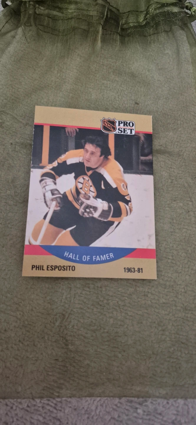 Selling a Phil Esposito hockey card from the Pro Set NHL series. It's a Hall of Famer card, commemorating his career from 1963-81. A great addition to any hockey card collection!