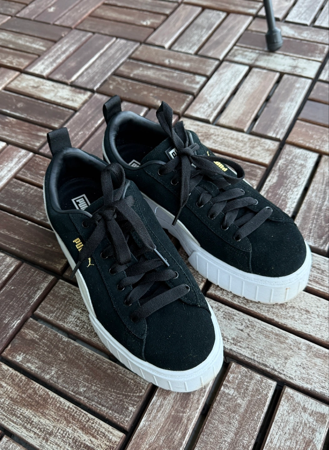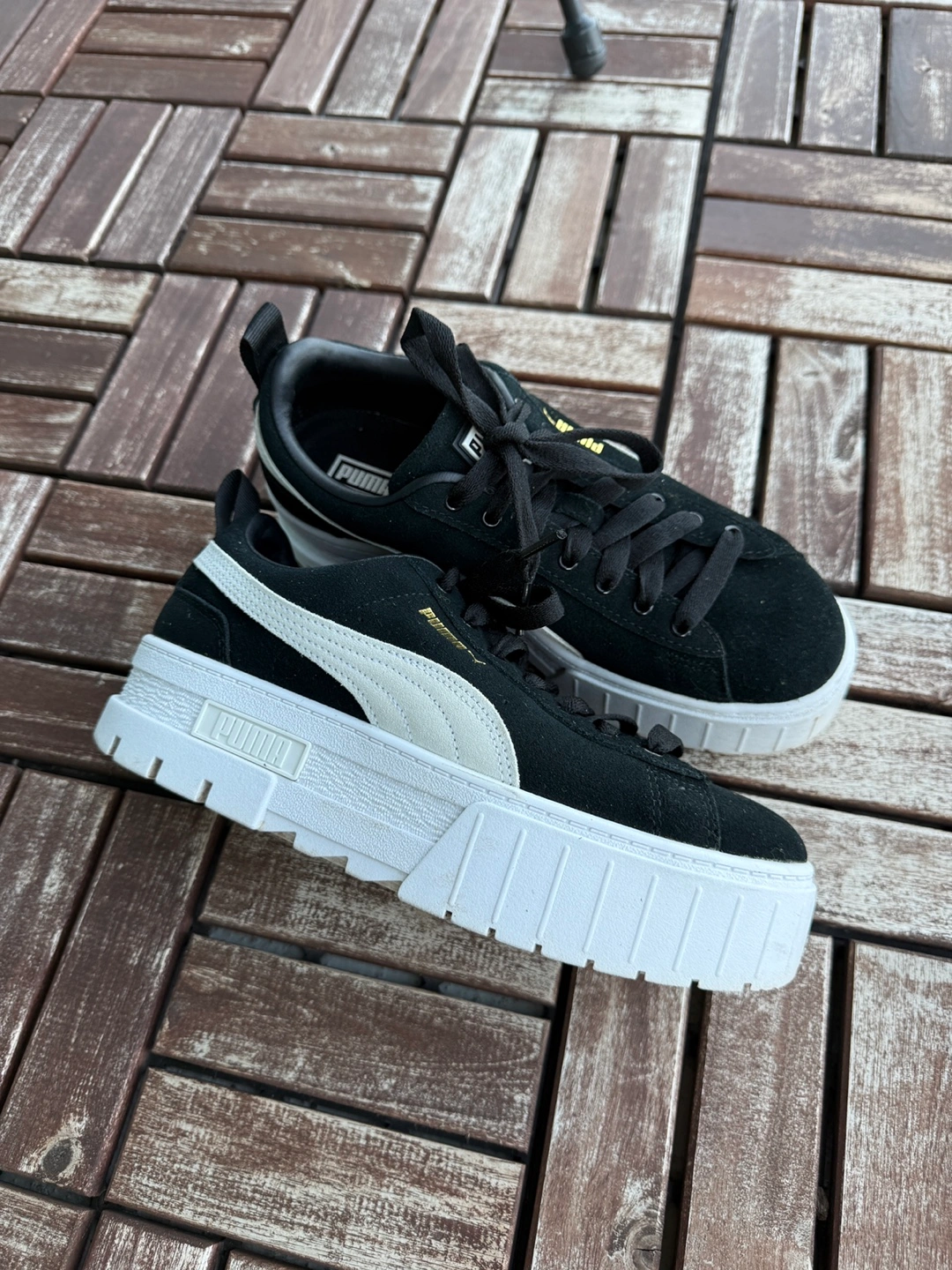 Selling a pair of Puma Mayze Stack sneakers in women's size 8! They're in great shape and ready for a new home. These stylish sneakers feature a black and white design with a chunky platform sole. Perfect for adding a bit of height and style to your everyday look