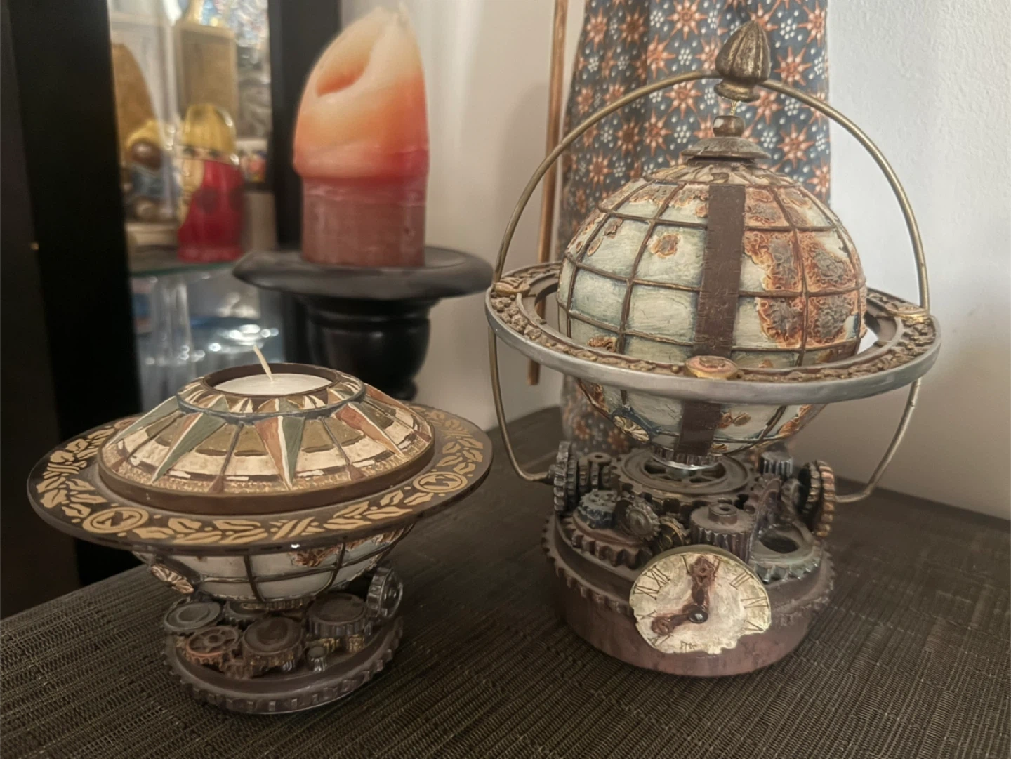 80Selling a charming set of steampunk-style decorative pieces! This set includes a music box globe and a candle holder, both featuring intricate gear details and a unique, rustic aesthetic. Perfect for adding a touch of vintage-industrial flair to any room!