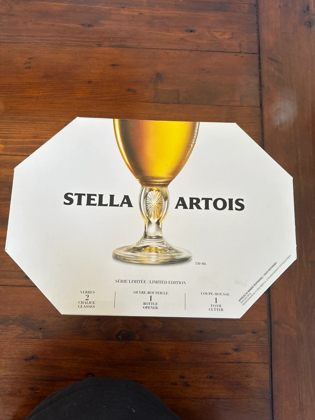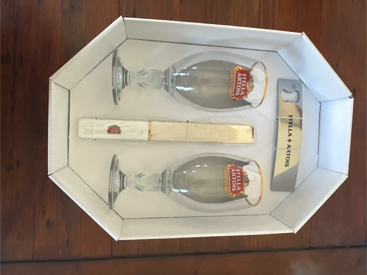 10Selling a Stella Artois Limited Edition Chalice Glasses Set! The set includes two chalice glasses, a bottle opener, and a foam cutter, all neatly arranged in its original packaging. Perfect for enjoying your favourite Stella Artois brew in style!