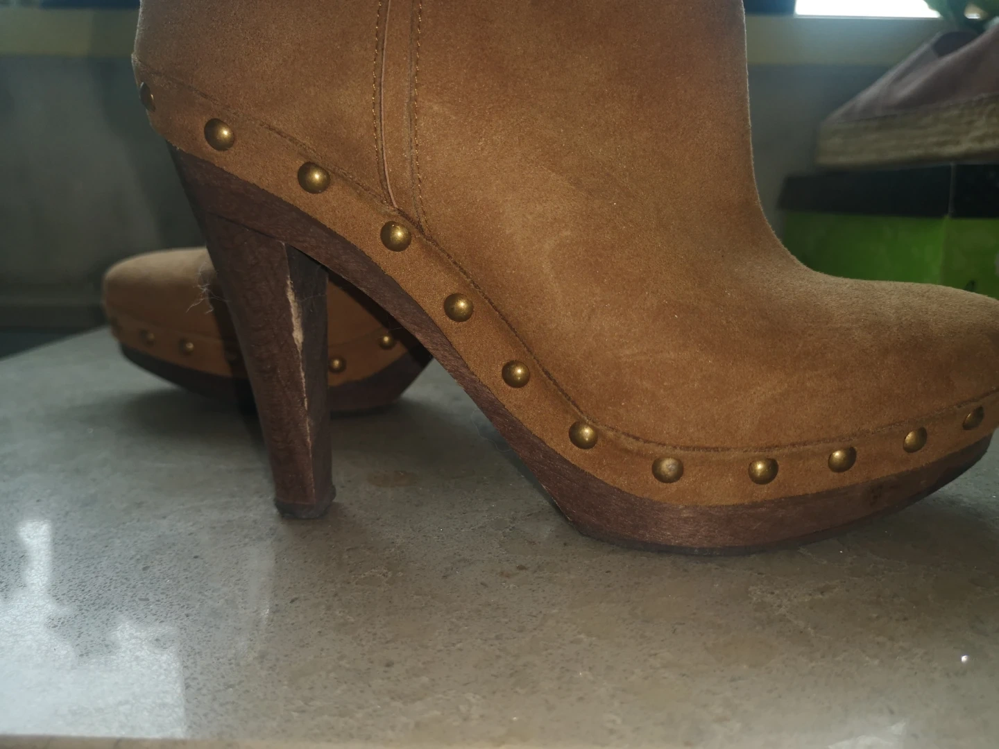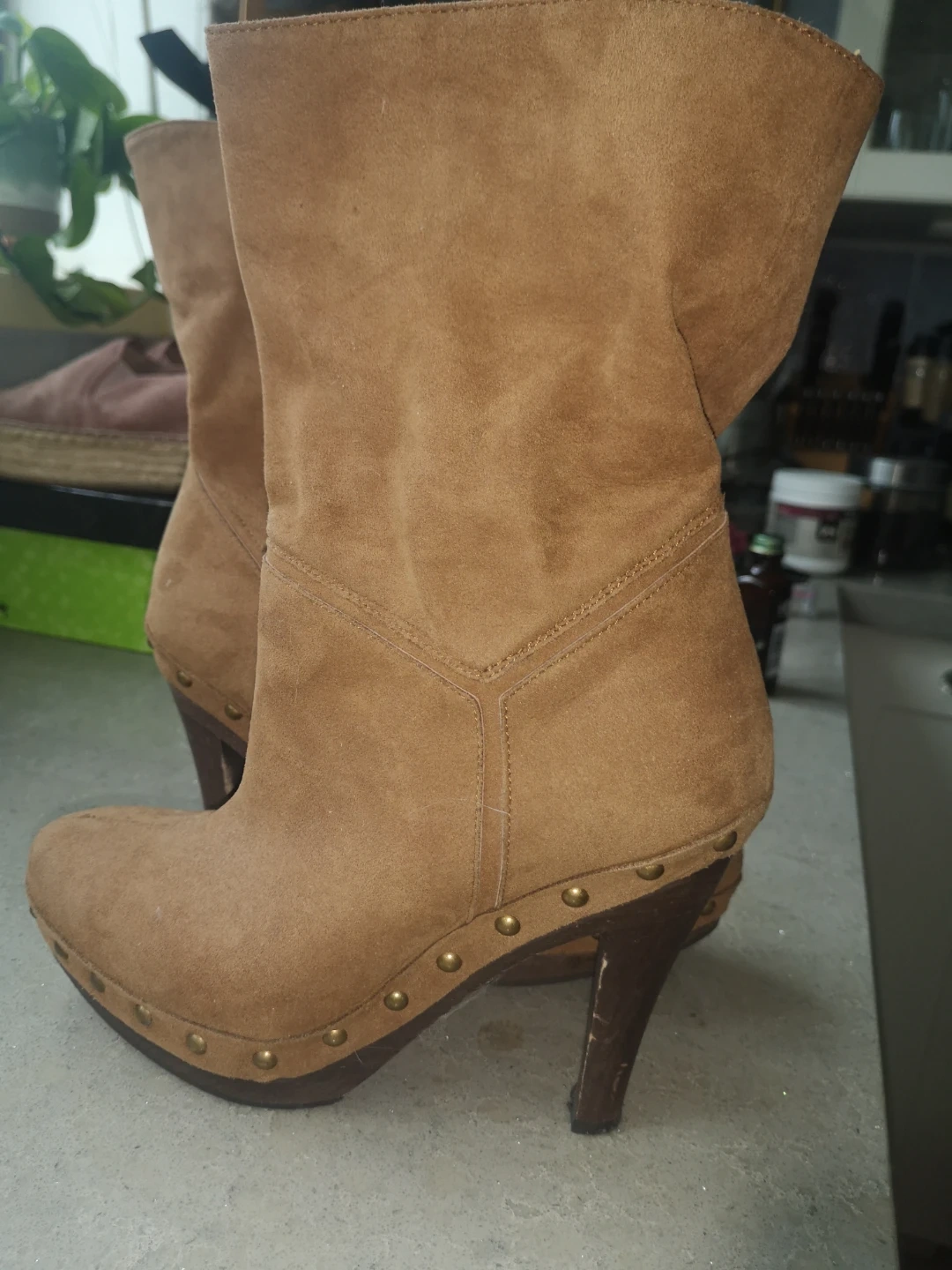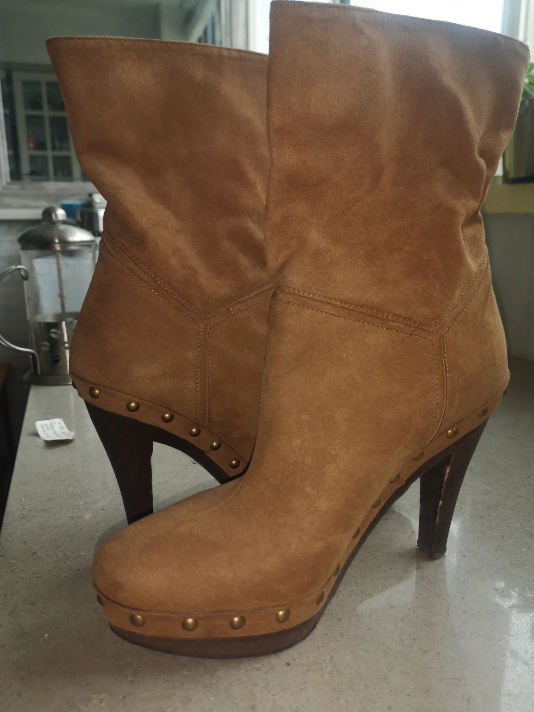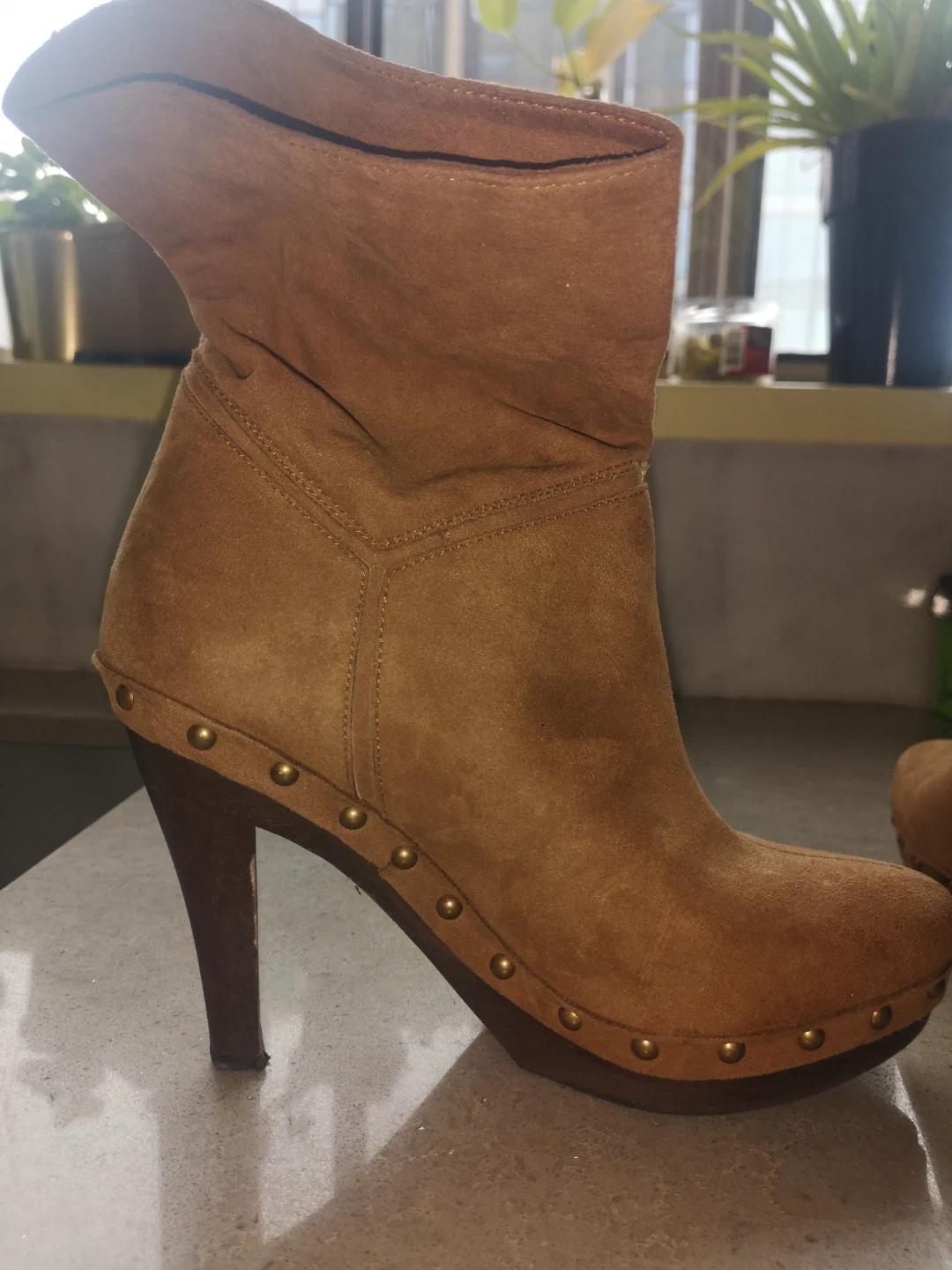 15Stella McCartney Women's faux brown suede ankle booties. Features a high heel and platform. Studded detailing on the sole. Good pre-owned condition.
