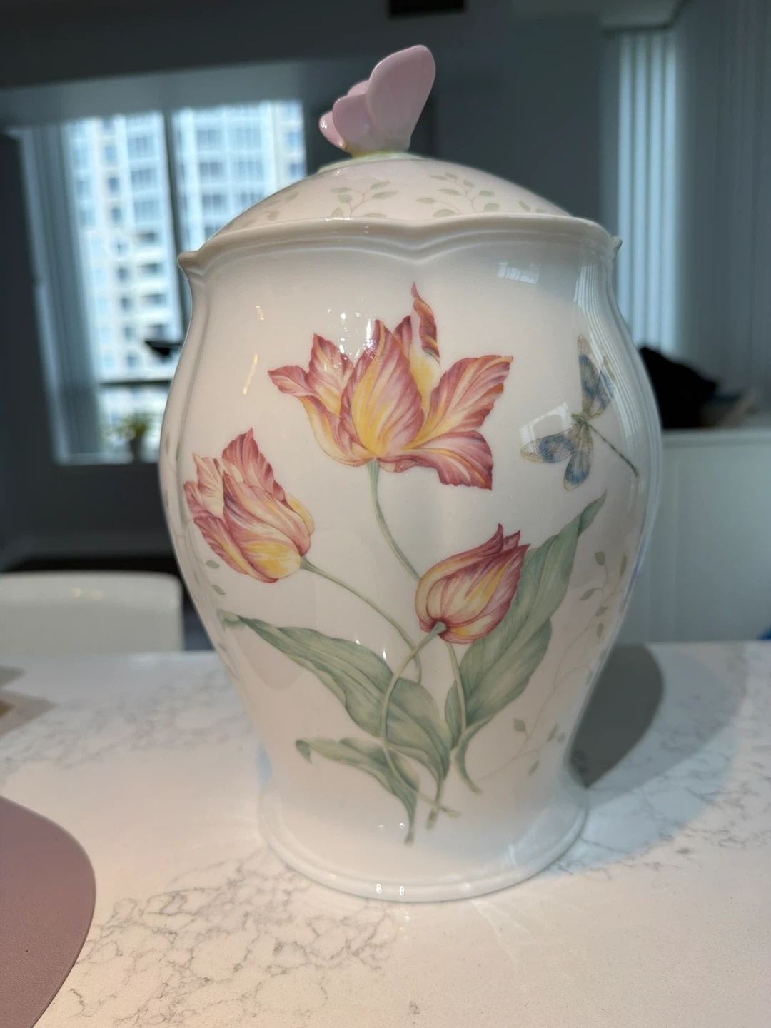 Selling a Lenox Butterfly Meadow covered jar. It features a beautiful floral design with tulips and a butterfly accent on the lid. Perfect for adding a touch of elegance to your home decor!