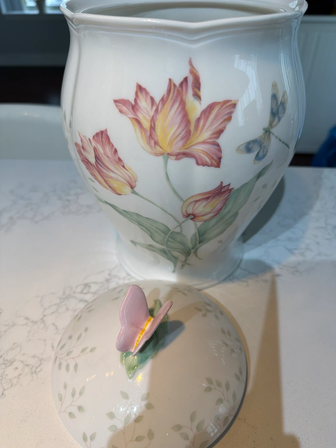 Selling a Lenox Butterfly Meadow covered jar. It features a beautiful floral design with tulips and a butterfly accent on the lid. Perfect for adding a touch of elegance to your home decor!