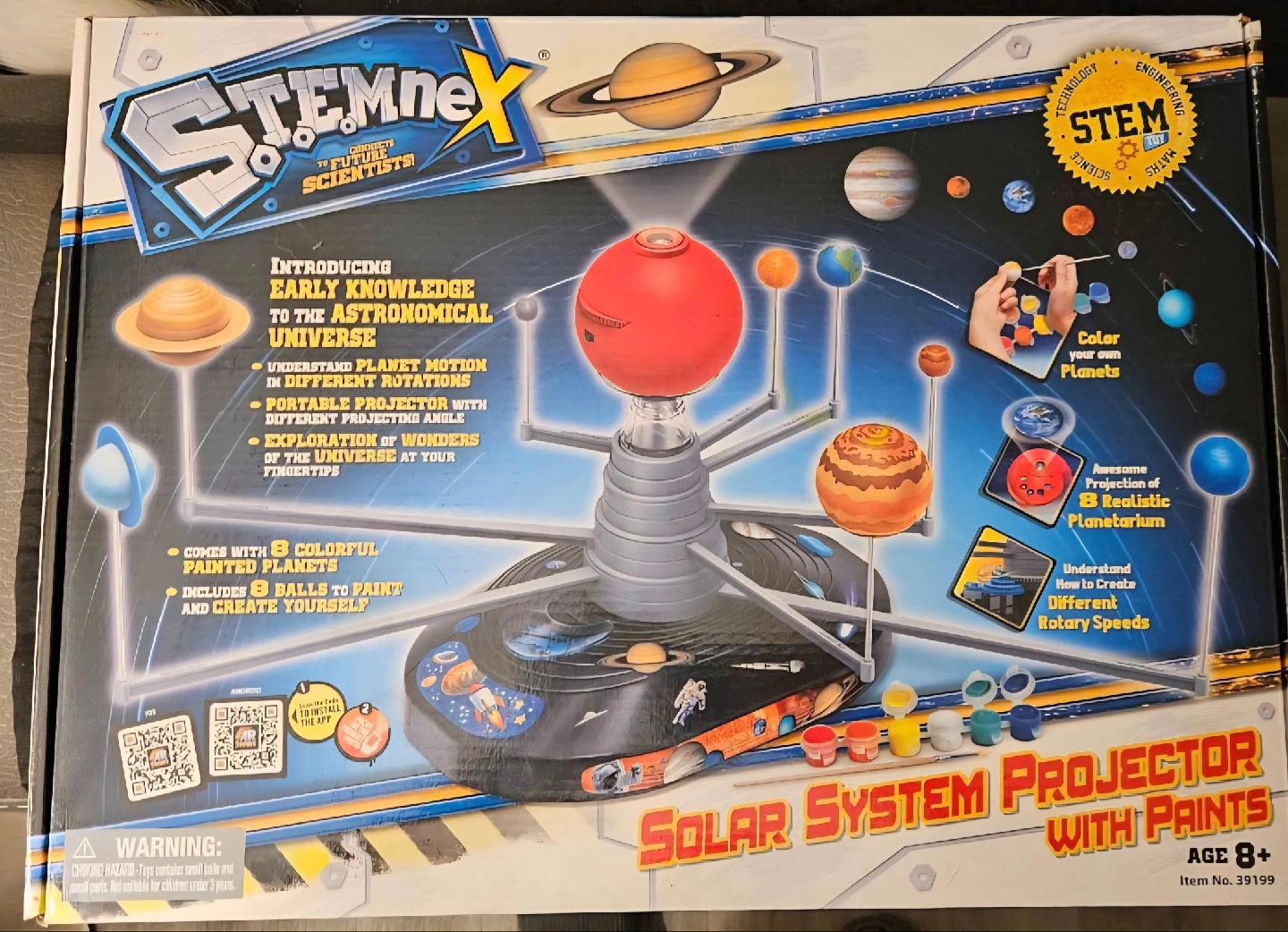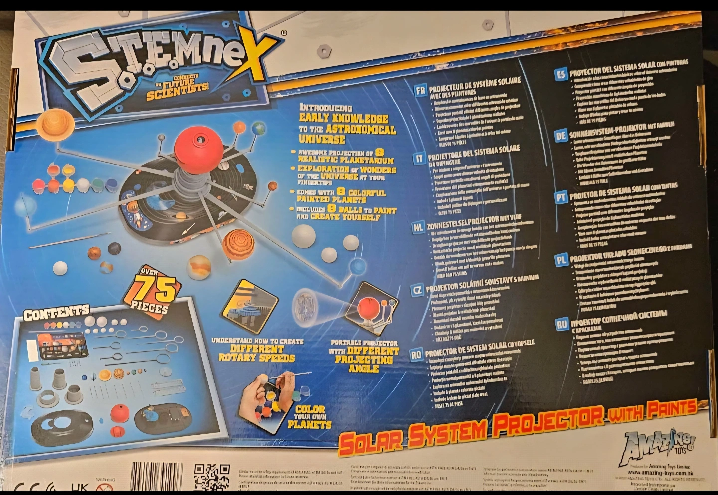 Explore the wonders of the universe with this STEMnex Solar System Projector kit! It's designed for ages 8 and up and includes everything you need to create your own painted planets. Comes with 8 colourful painted planets and 8 balls to paint and create yourself. Understand how to create different rotary speeds and enjoy awesome projection of 8 realistic planetarium scenes!