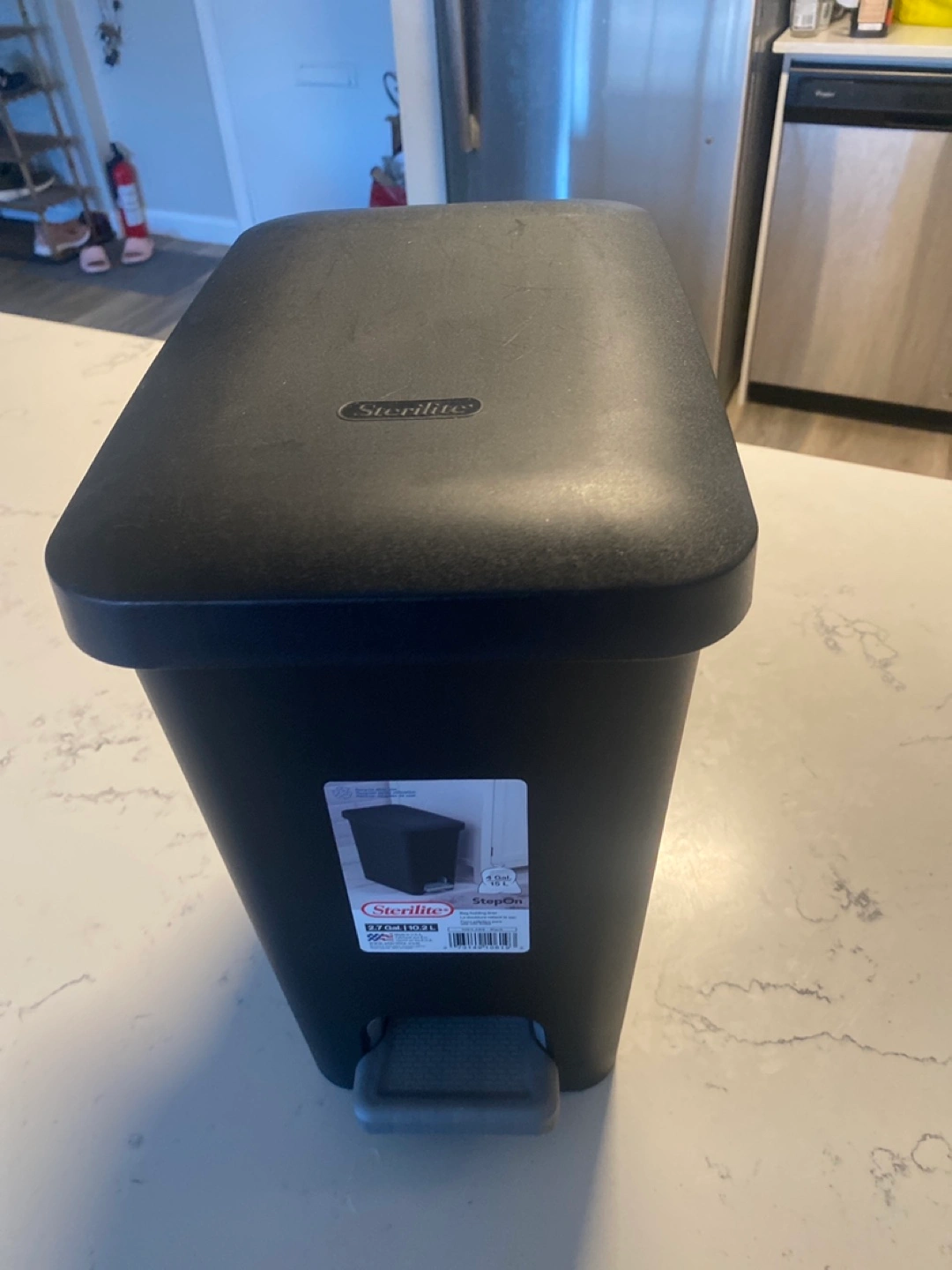 Black plastic step-on garbage can. Foot pedal. 13-gallon capacity.