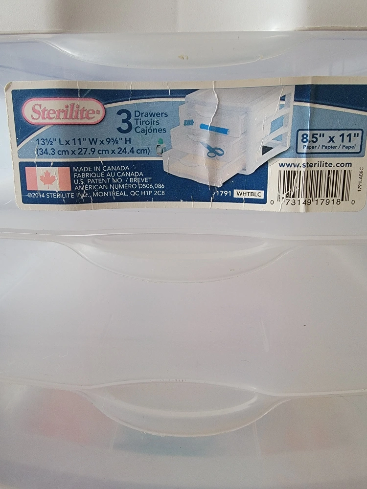 Selling a Sterilite 3-drawer unit! It's in great shape and ready to help you organize your space. The dimensions are 13.5" L x 11" W x 9.5" H (34.3 cm x 27.9 cm x 24.4 cm). Perfect for paper sized 8.5" x 11". Made in Canada!