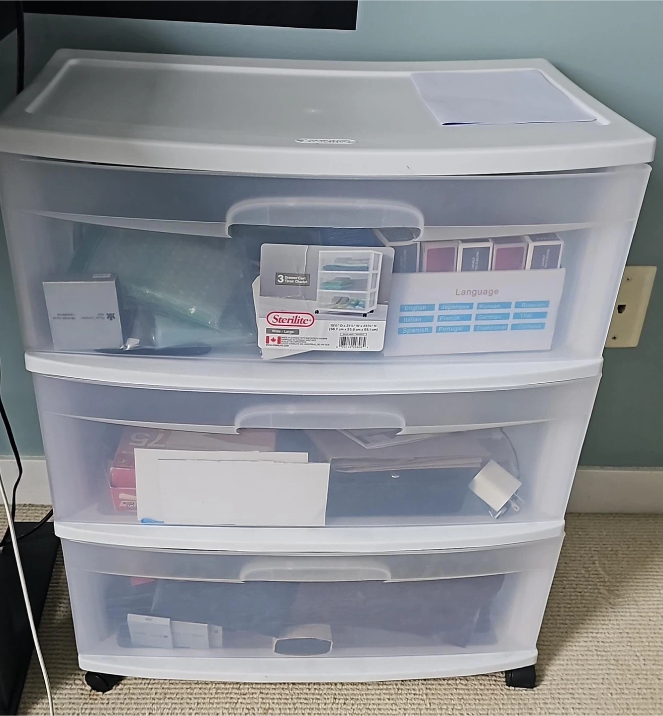 10Selling a Sterilite 3-drawer wide cart! It's great for organizing and storing various items around the house. The clear drawers make it easy to see what's inside. It's in good condition and ready for a new home!