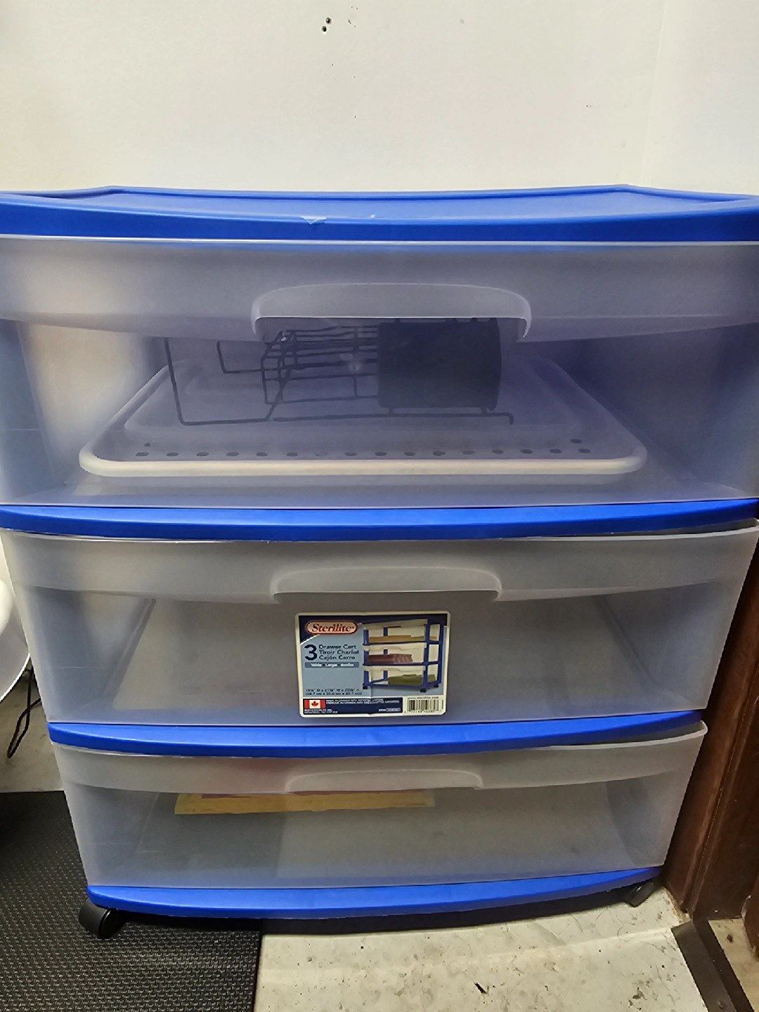 10Selling a Sterilite 3-Drawer Wide Weave Tower in good condition! It's great for organizing and decluttering any room. The drawers slide smoothly, and the tower is easy to move around with its built-in wheels. Perfect for storing clothes, toys, or office supplies