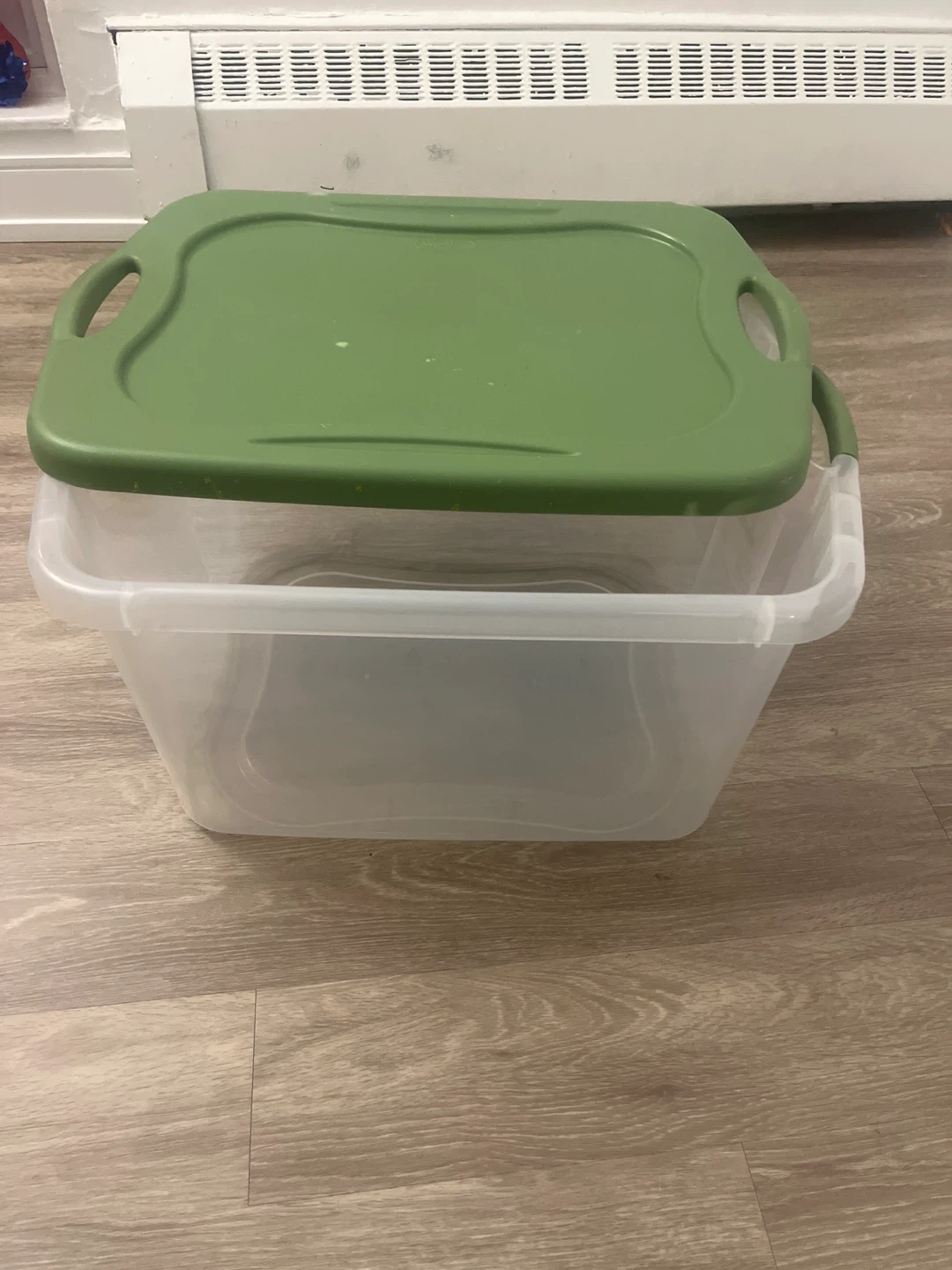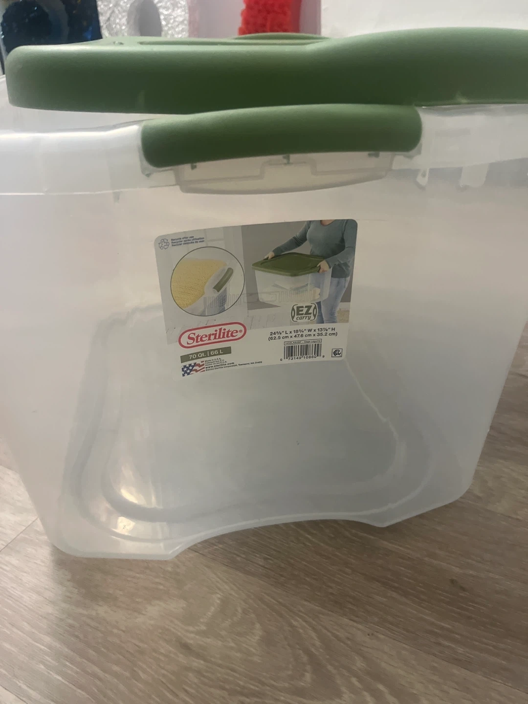 Selling a Sterilite 70 Qt EZ Carry storage box! It's clear with a green lid and is in great condition. Perfect for organizing your belongings!