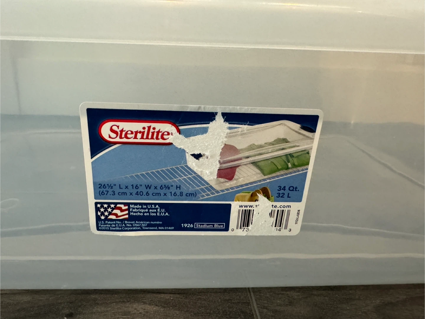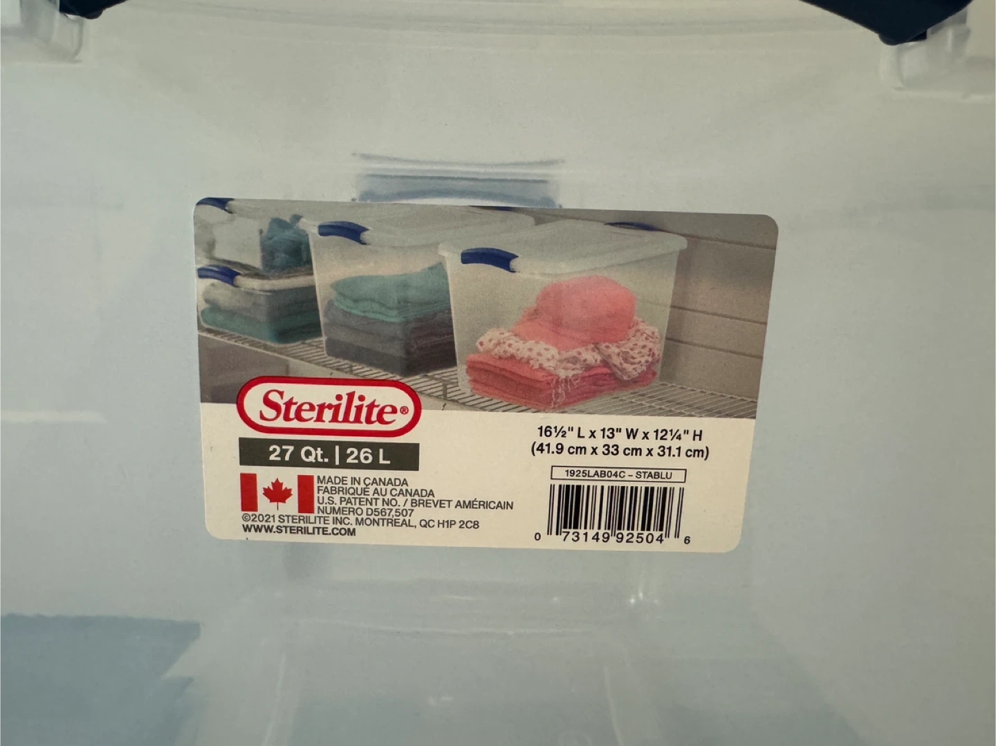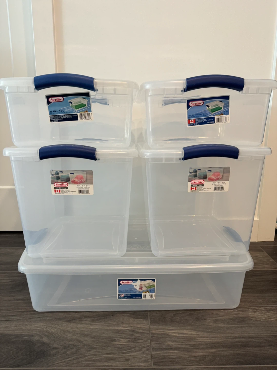 50Sterilite storage boxes - stackable set These storage boxes are in great shape and ready to help you organize your space. They are perfect for storing clothes, toys, or anything else you need to keep neat and tidy. You can use them as a stackable set like in the photo or simply use one by one. 1 x 32L: 26 1/2 L x 16W x 6 5/8H (67.3 x 40.6 x 16.8cm) 2 x 26L: 16 1/2 L x 13W x 12 1/4 H (41.9 x 33 x 31.1cm) 2 x 14L: 16 1/2 L x 13W x 6 5/8H (41.9 x 33 x 16.8cm) Made in Canada and U. S. A Pick up in Windermere