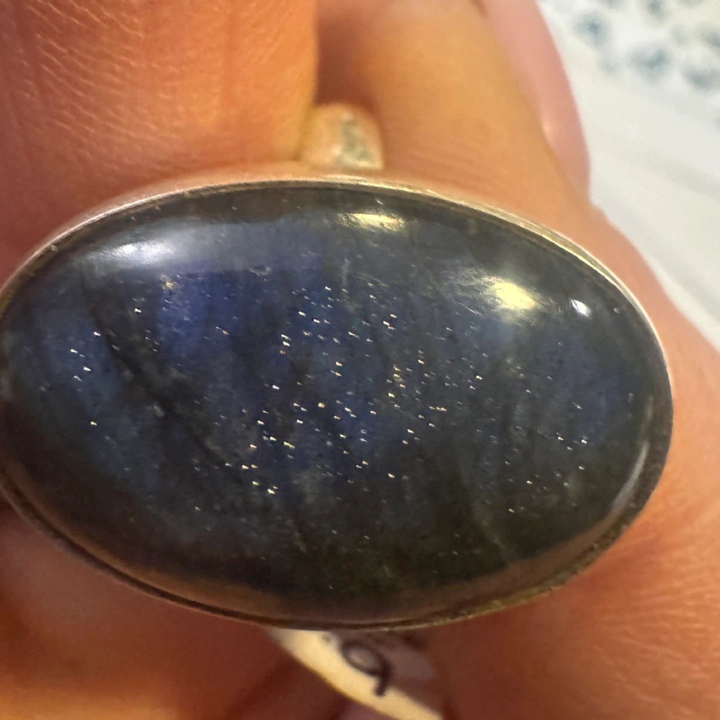 Oval-shaped labradorite gemstone. Silver band. Size not specified.