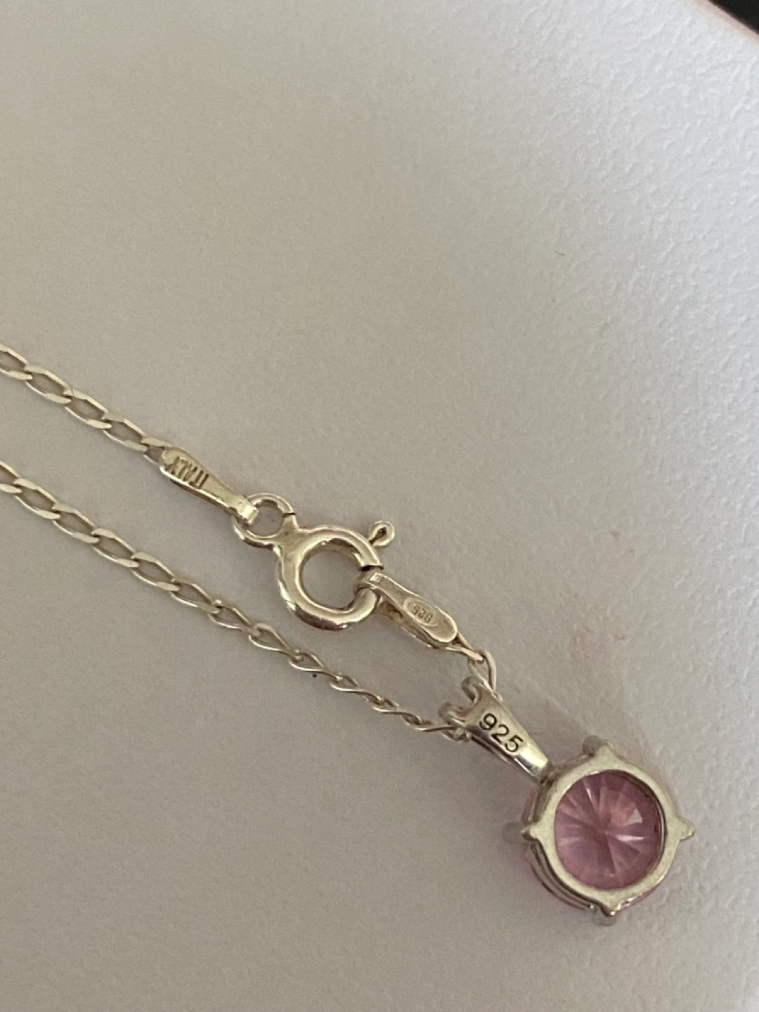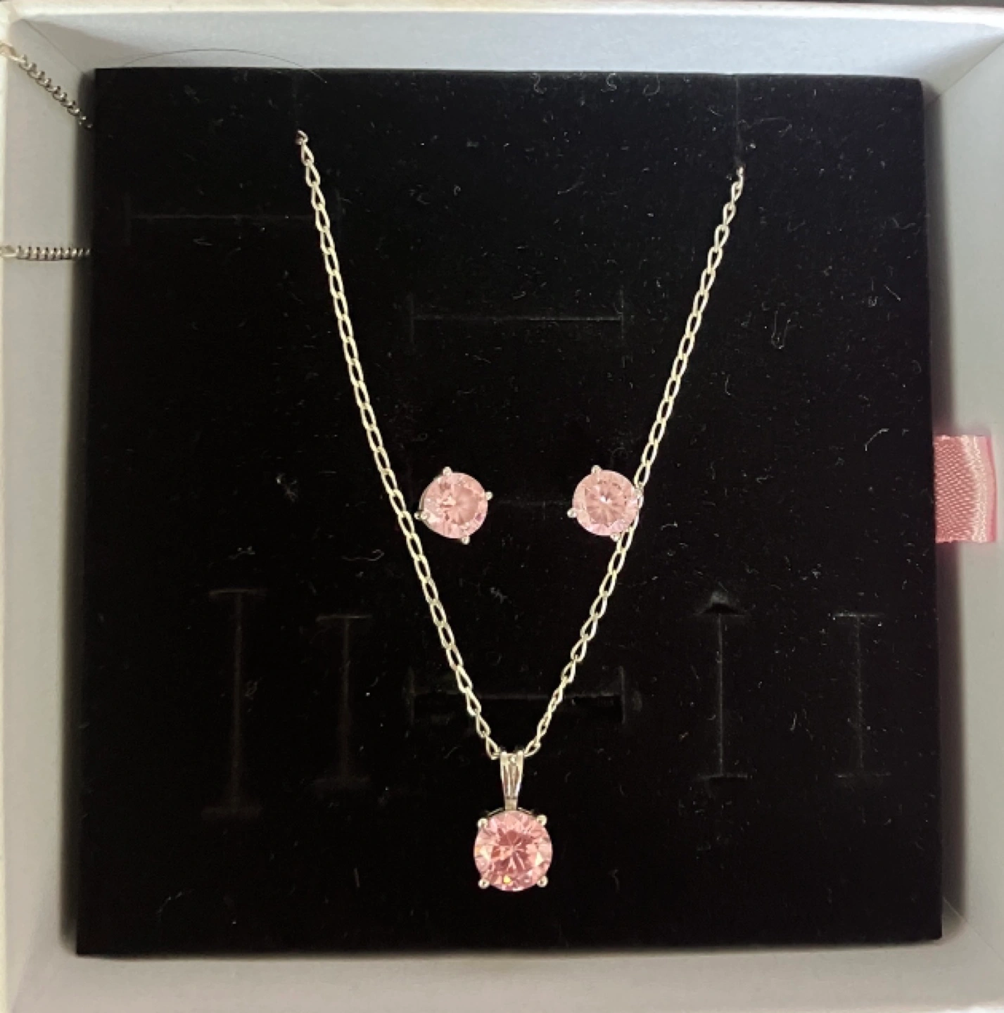 Sterling silver necklace and earrings set with pink CZ stones. It has 925 branded and the necklace chain is made in Italy. I donot have the original box for this I took picture in a pandora box I have which I can give with the set. Perfect for valentines present