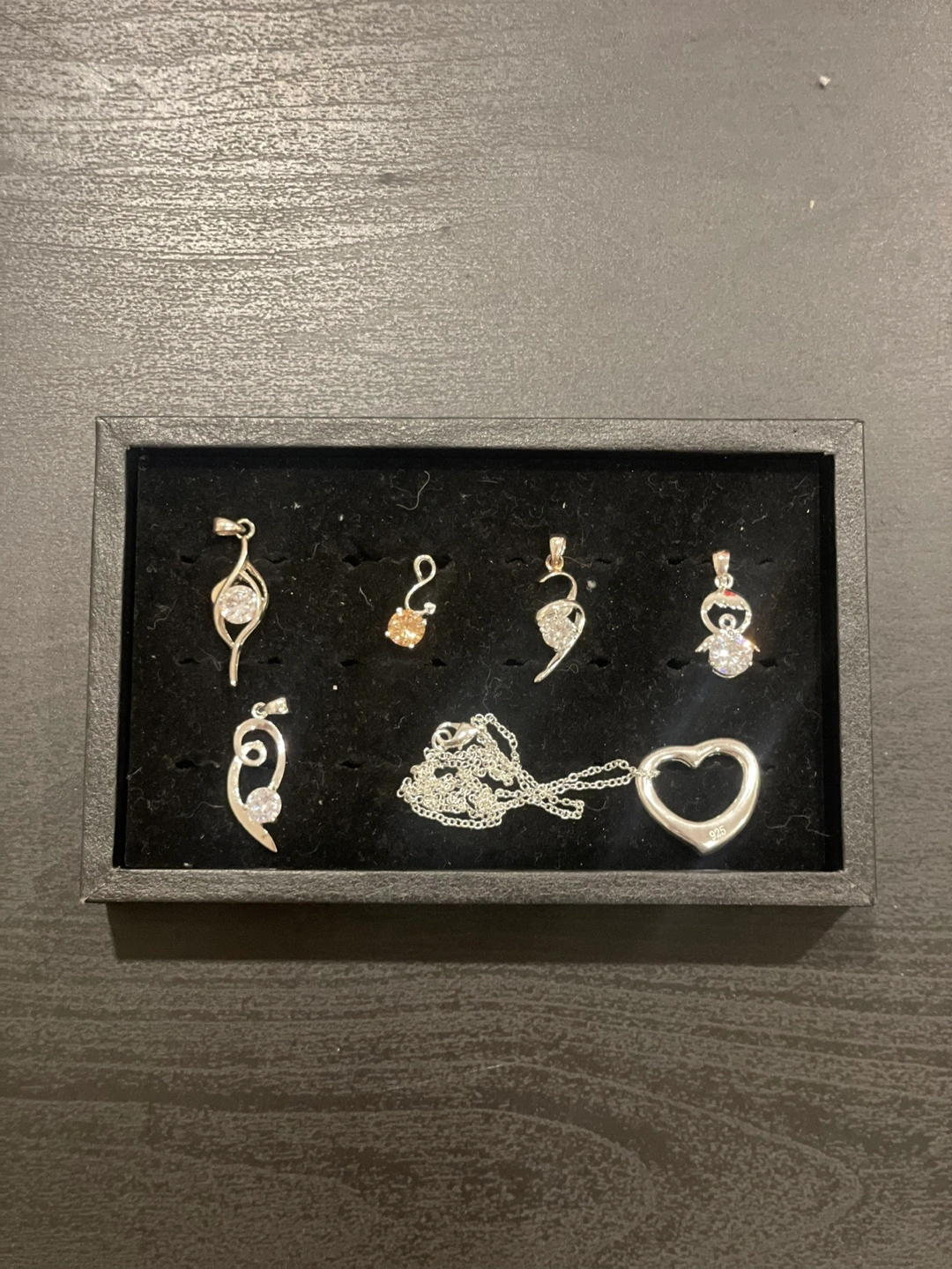 Collection of silver pendants and necklaces. Various styles and designs. Includes a heart-shaped pendant on a chain. Great for layering or gifting.