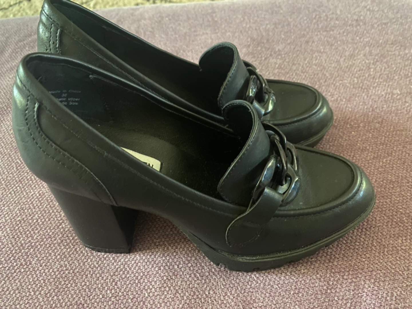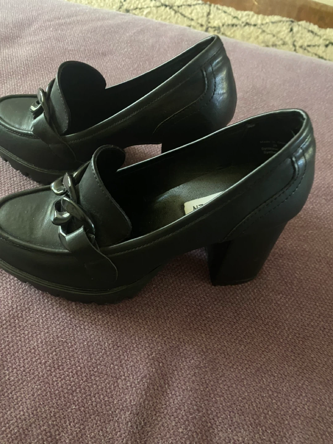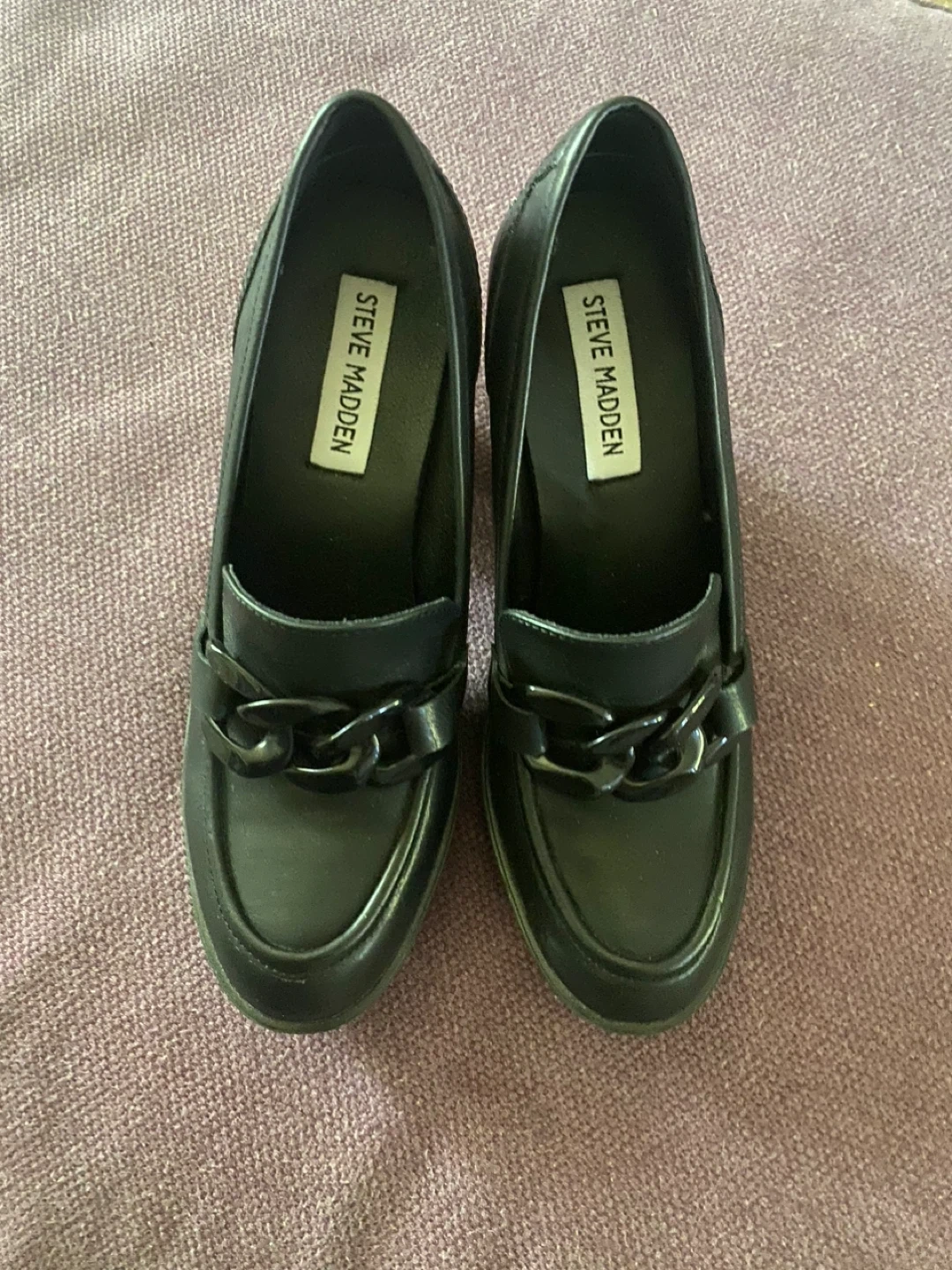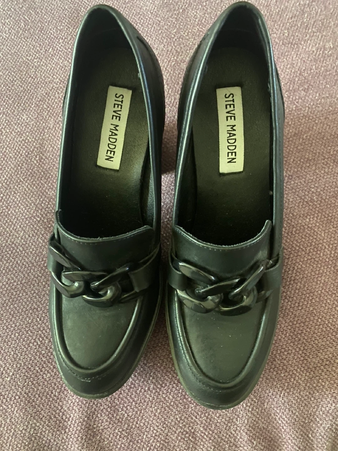 Selling a pair of Steve Madden black heeled loafers. They are a size 8 and in great condition. Perfect for adding a bit of edge to any outfit!