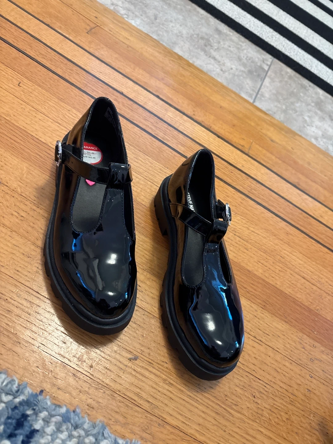 Cute Steve Madden Mary Janes in a shiny black patent finish! They're in great condition and ready for a new home. Kids size 5 women’s 7