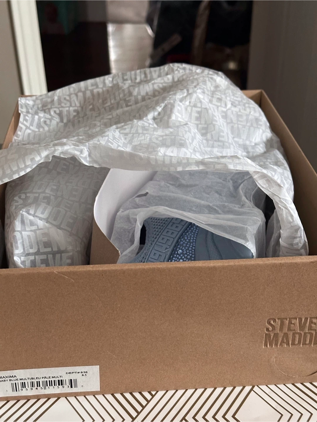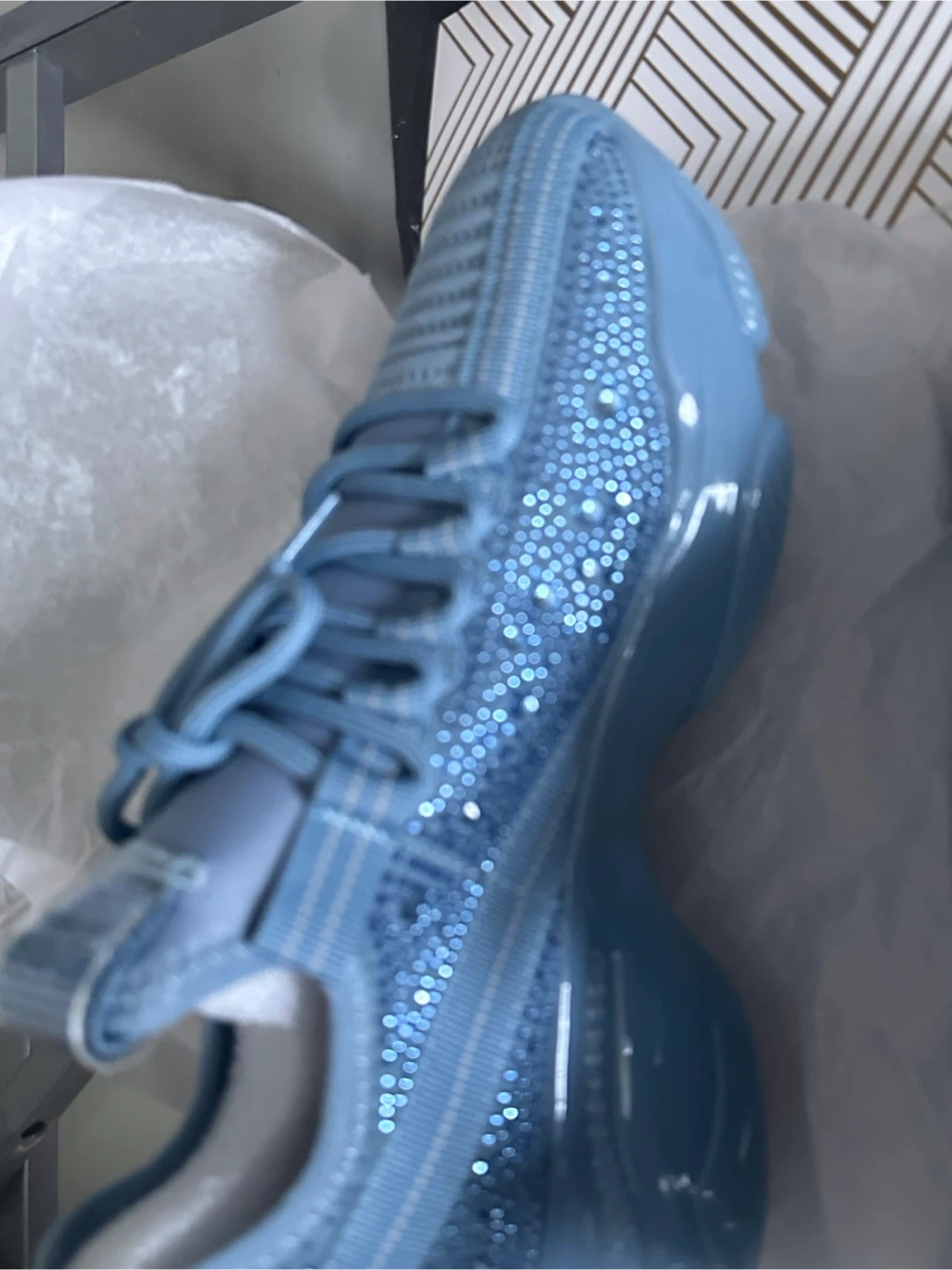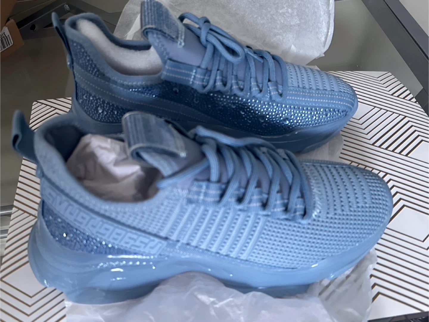 10These Steve Madden sneakers are brand new and come in the original box! The shoes are a light blue colour and feature bling detailing. Perfect for adding a bit of sparkle to your everyday look!