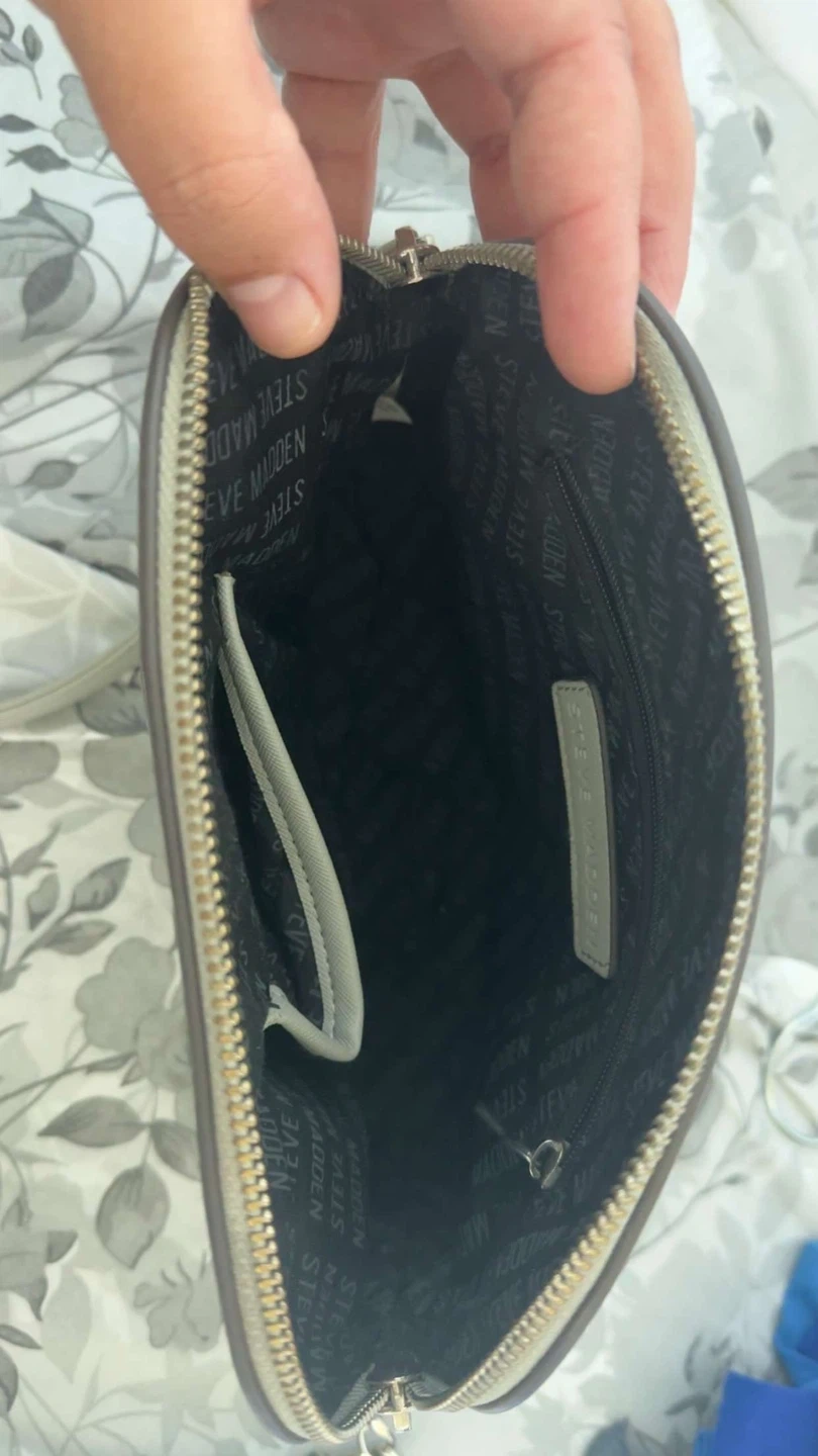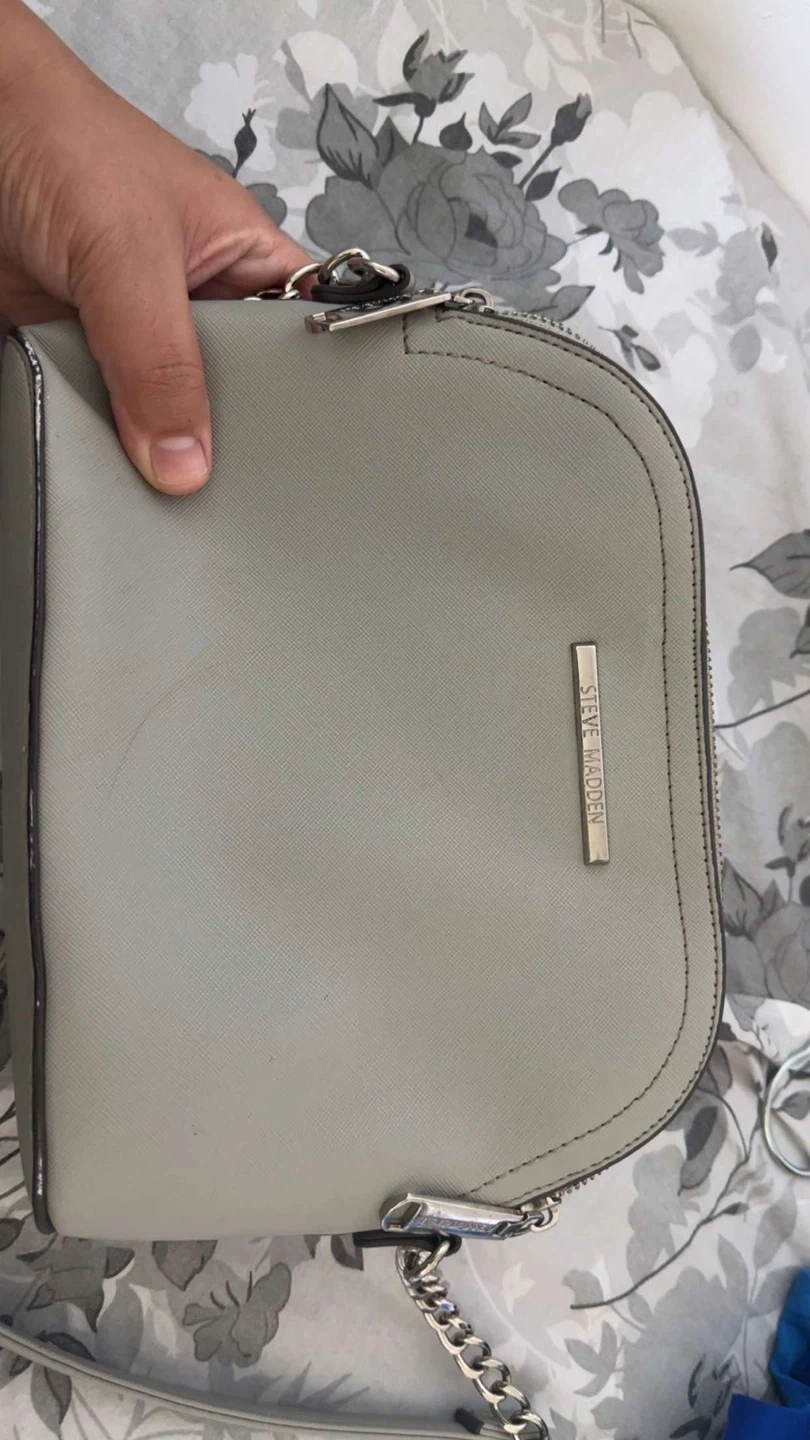 Selling a cute Steve Madden crossbody bag in grey! It's in great condition and perfect for everyday use. The interior has a fun Steve Madden print, and it's a great size for carrying your essentials.