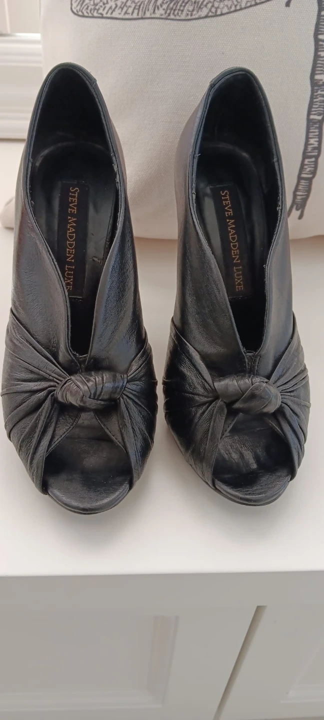 677Selling a pair of Steve Madden Luxe black heels in size 6! They're in good condition and would be perfect for dressing up an outfit. The heels have a unique knotted detail on the front, adding a touch of elegance to the classic black heel.