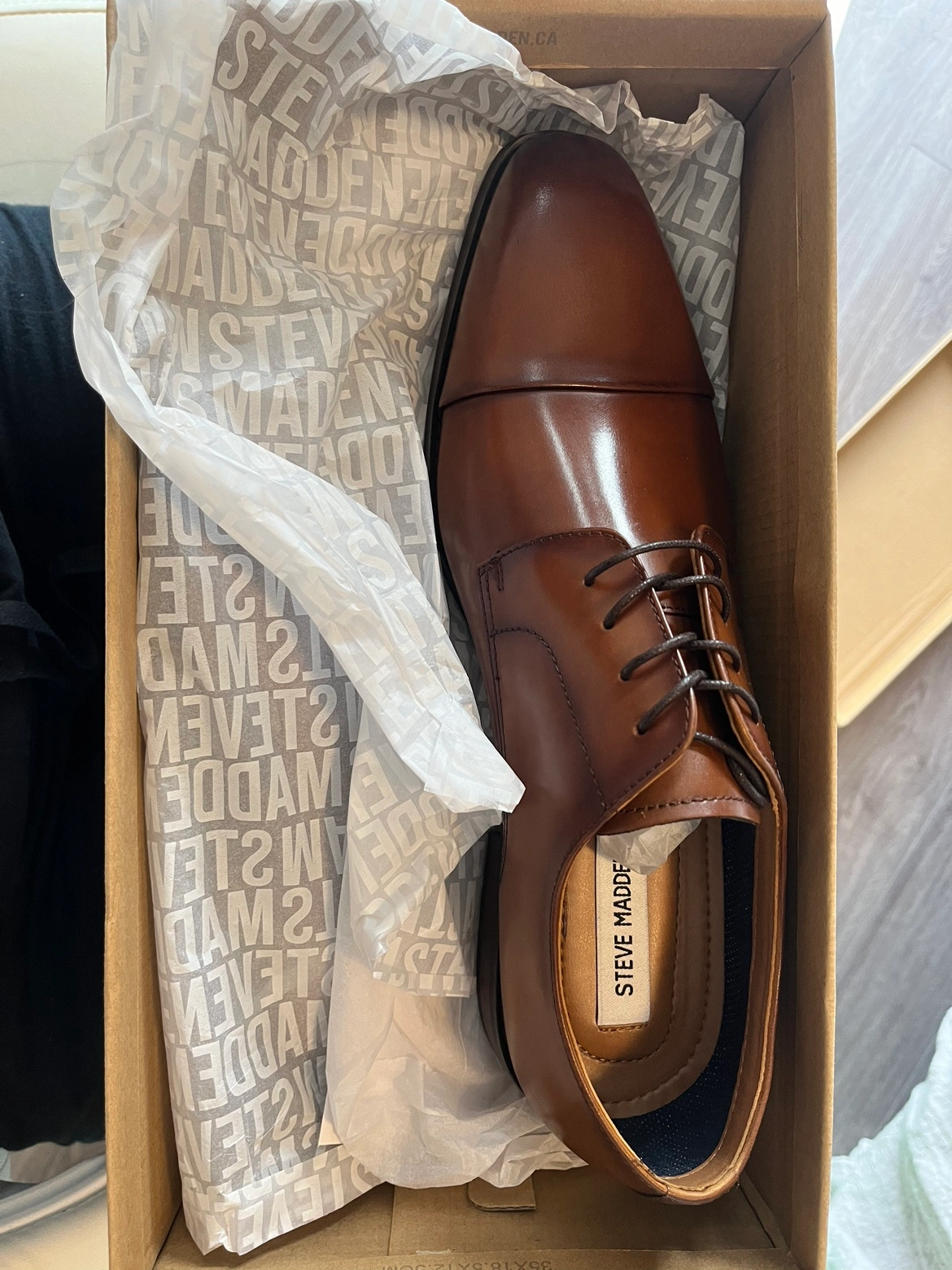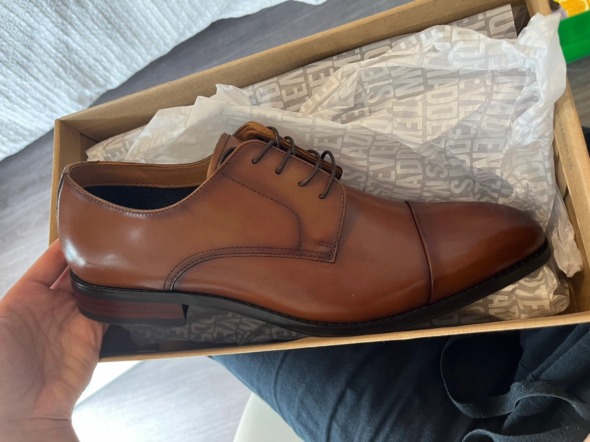 Steve Madden men’s dress shoes in tan leather, size 10. Brand new, unworn, in the original box. Great for work or any formal occasion!