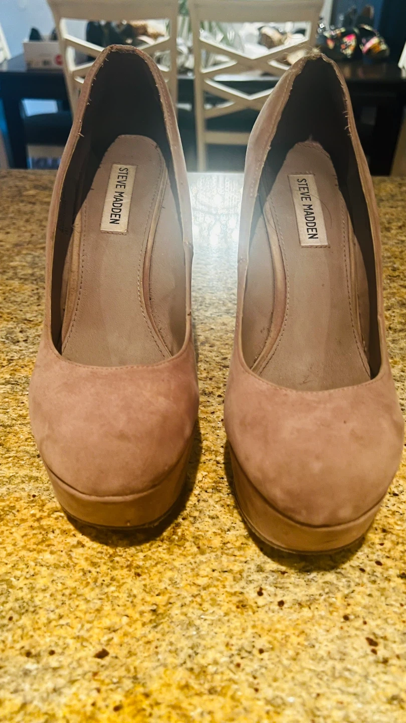 5Selling a pair of Steve Madden wedge heels in size 10. They are a lovely grey/beige colour and have a suede texture. The heel height is approximately 4.5 inches. They are in good condition!