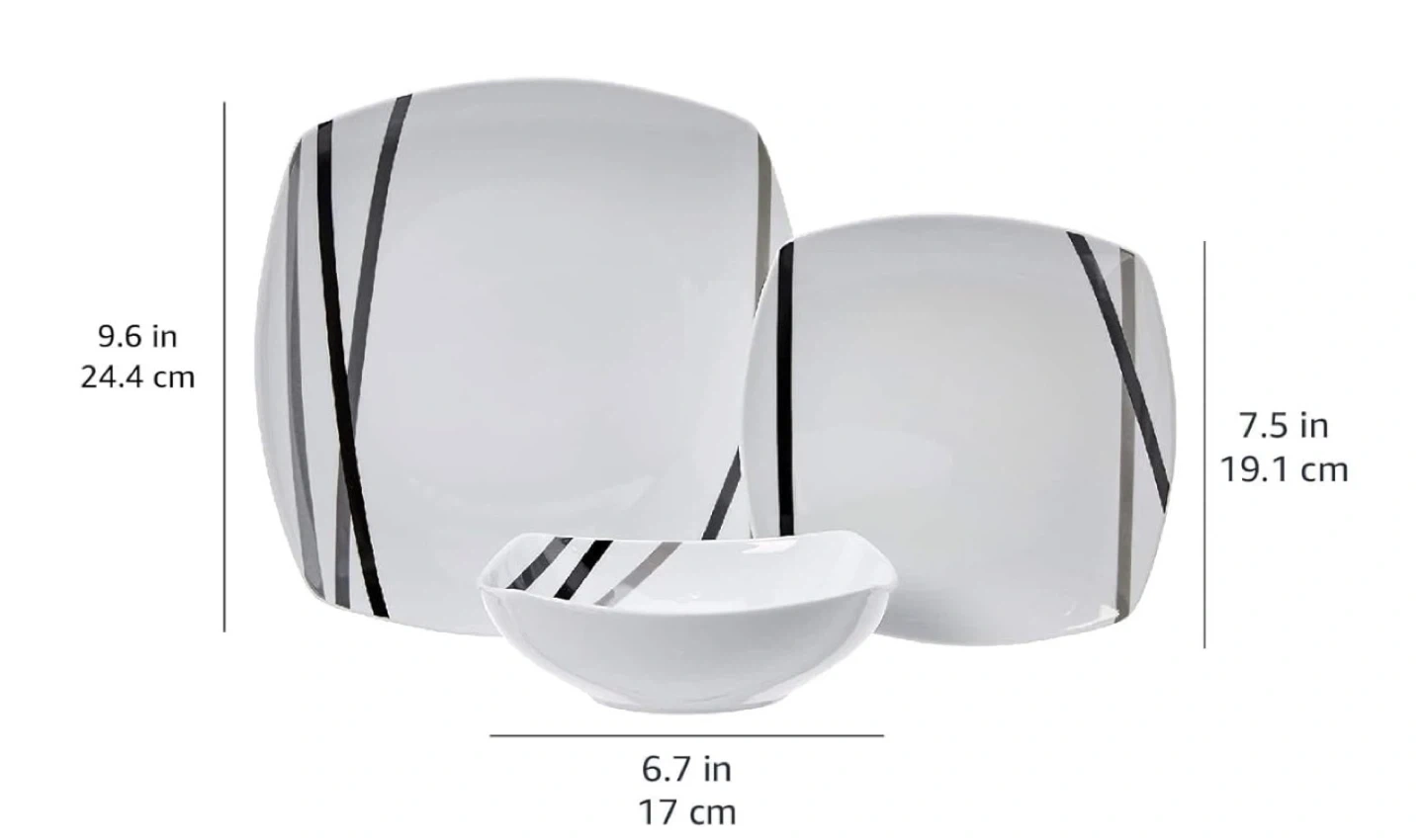 Includes 6 each: 9.6-inch dinner plate, 7.5-inch salad/dessert plate, and 6.7-inch bowl
