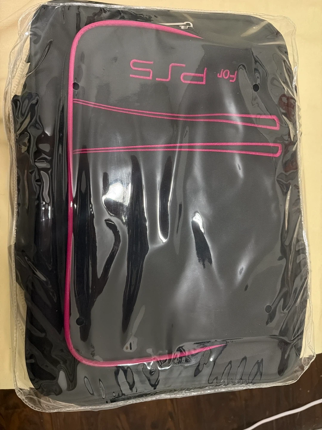 Selling a PS5 carrying case. It's black with pink trim and appears to be in new condition, still in the original packaging. Perfect for safely transporting your console!