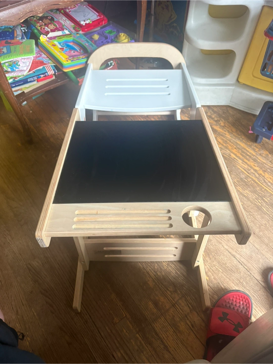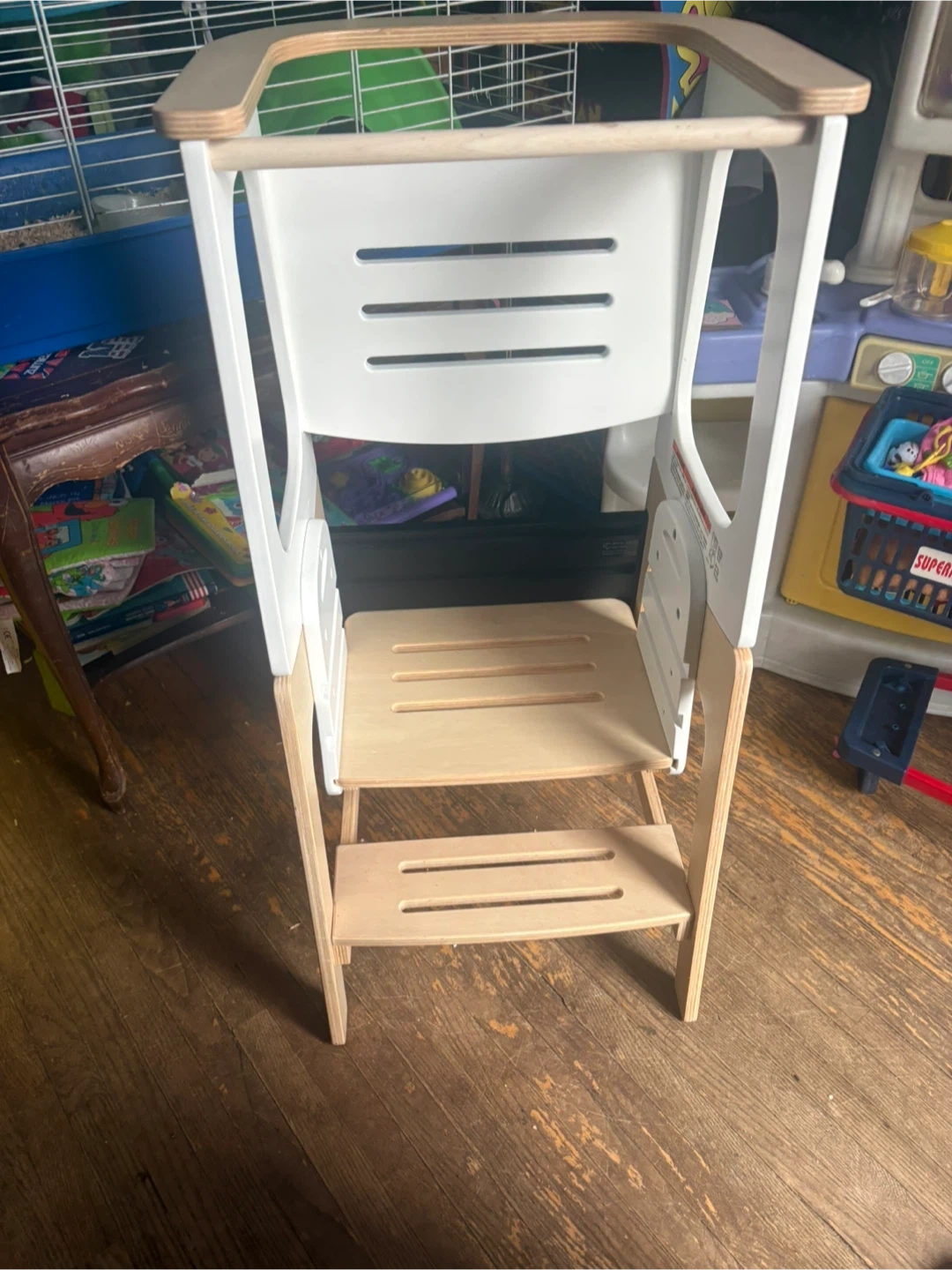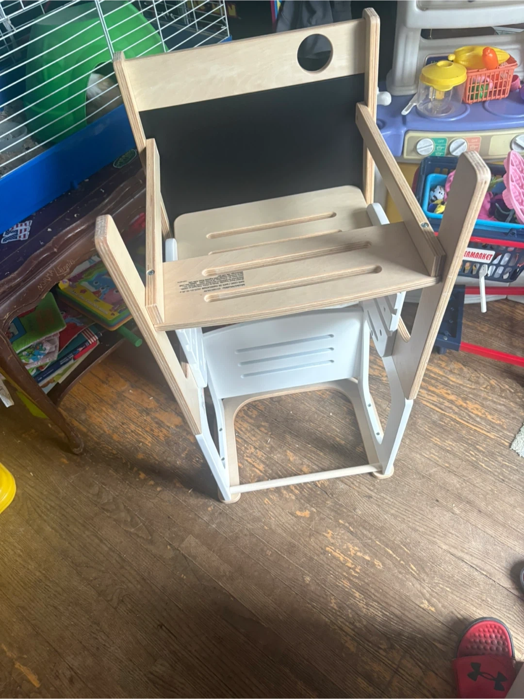 This Maxi-Cosi Toucan learning tower is designed for toddlers. It transforms into a desk and chair and features a built-in chalkboard. It's made with natural wood and white accents. This is a great item to help your little one join in kitchen activities!
