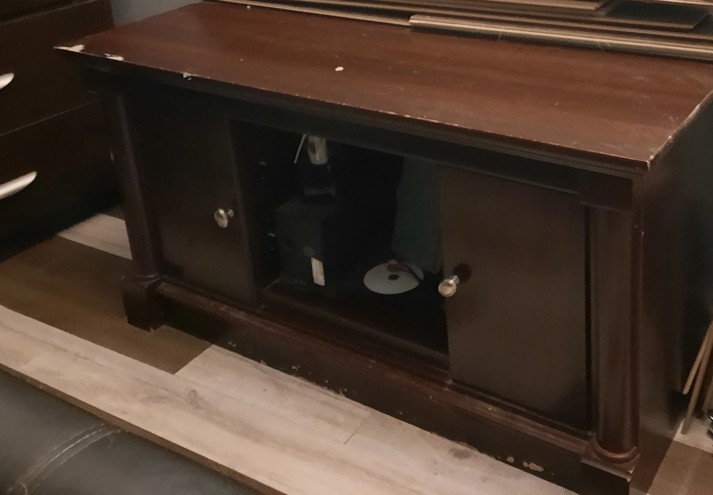 Selling a dark brown TV stand with doors. It has some signs of wear and tear, as you can see in the photos, but it's still functional and sturdy. Great for adding some storage to your living room or having yourself a nice bon fire 🔥